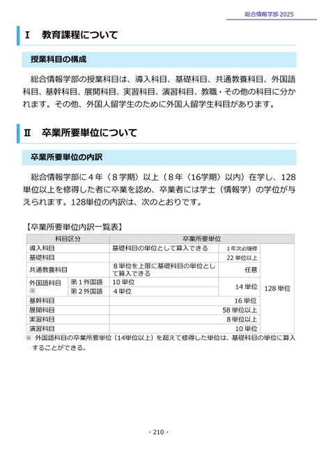 Ⅰ教育課程について授業科目の構成総合情報学部2025総合情報学部の授業科目は、導入科目、基礎科目、共通教養科目、外国語科目、基幹科目、展開科目、実習科目、演習科目、教職・その他の科目に分かれます。その他、外国人留学生のために外国人留学生科目があります。卒業所要単位についてⅡ卒業所要単位の内訳総合情報学部に4年〈8学期〉以上(8年〈16学期〉以内)在学し、128単位以上を修得した者に卒業を認め、卒業者には学士(情報学)の学位が与えられます。128単位の内訳は、次のとおりです。【卒業所要単位内訳一覧表】卒業所要単位基礎科目の単位として算入できる8単位を上限に基礎科目の単位として算入できる10単位4単位1年次必履修22単位以上任意14単位128単位16単位58単位以上8単位以上10単位※外国語科目の卒業所要単位(14単位以上)を超えて修得した単位は、基礎科目の単位に算入科目区分導入科目基礎科目共通教養科目外国語科目※基幹科目展開科目実習科目演習科目第1外国語第2外国語することができる。-210-