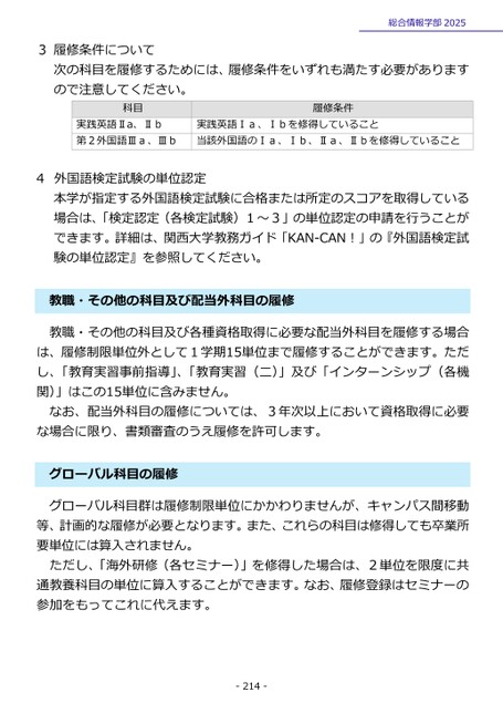 3履修条件について総合情報学部2025次の科目を履修するためには、履修条件をいずれも満たす必要がありますので注意してください。科目履修条件実践英語Ⅱa、Ⅱb第2外国語Ⅲa、Ⅲb実践英語Ⅰa、Ⅰbを修得していること当該外国語のⅠa、Ⅰb、Ⅱa、Ⅱbを修得していること外国語検定試験の単位認定本学が指定する外国語検定試験に合格または所定のスコアを取得している場合は、「検定認定(各検定試験)1~3」の単位認定の申請を行うことができます。詳細は、関西大学教務ガイド「KAN-CAN!」の『外国語検定試験の単位認定』を参照してください。4教職・その他の科目及び配当外科目の履修教職・その他の科目及び各種資格取得に必要な配当外科目を履修する場合は、履修制限単位外として1学期15単位まで履修することができます。ただし、「教育実習事前指導」、「教育実習(二)」及び「インターンシップ(各機関)」はこの15単位に含みません。なお、配当外科目の履修については、3年次以上において資格取得に必要な場合に限り、書類審査のうえ履修を許可します。グローバル科目の履修グローバル科目群は履修制限単位にかかわりませんが、キャンパス間移動等、計画的な履修が必要となります。また、これらの科目は修得しても卒業所要単位には算入されません。ただし、「海外研修(各セミナー)」を修得した場合は、2単位を限度に共通教養科目の単位に算入することができます。なお、履修登録はセミナーの参加をもってこれに代えます。-214-