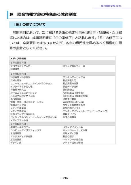 Ⅳ総合情報学部の特色ある教育制度「系」の修了について総合情報学部2025展開科目において、次に掲げる各系の指定科目を18科目(36単位)以上修得した場合は、成績証明書に「○○系修了」と記載します。「系」の修了については、卒業要件ではありませんが、各自の専門性を深めるべく積極的に履修の指針としてください。メディア情報系1年次配当科目プログラミング入門認知科学2年次配当科目科学倫理・科学哲学認知心理学ヒューマンエージェントインタラクションインターネットと心理行動科学研究法身体とコミュニケーション共生と学びのデザイン論現代社会論情報・文化・コミュニケーション情報メディア論メディア産業論メディア表現論映像メディアと現代社会ヴィジュアルコミュニケーション・デザイン論メディアアート論3年次配当科目情報アーキテクチャコンピュータ・グラフィックス言語情報論マルチメディア教育論広告実践論デザイン論メディアカルチャー論デジタルアーカイブ論社会調査入門社会調査方法論調査データ分析質的調査法知的財産法(著作権)知的財産法(産業財産権)消費者行動論Web情報システム論サウンド知覚情報処理認知ロボティクスエンターテインメント・コンピューティング景観デザインリスク情報論メディアイベント論ネットジャーナリズム論地域メディア論社会心理学ネットワーク社会論メディア法制と倫理-216-