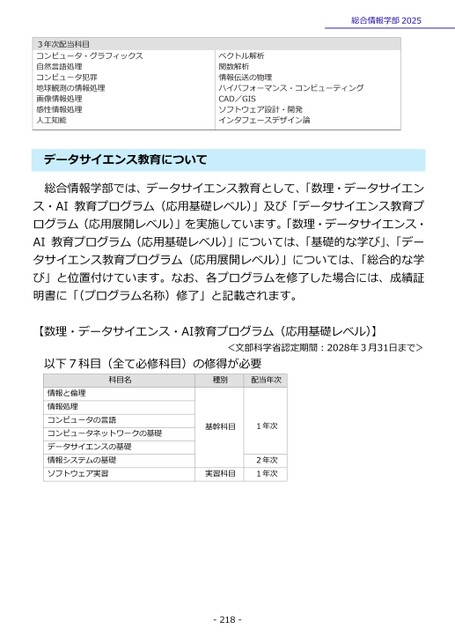 3年次配当科目コンピュータ・グラフィックス自然言語処理コンピュータ犯罪地球観測の情報処理画像情報処理感性情報処理人工知能総合情報学部2025ベクトル解析関数解析情報伝送の物理ハイパフォーマンス・コンピューティングCAD/GISソフトウェア設計・開発インタフェースデザイン論データサイエンス教育について総合情報学部では、データサイエンス教育として、「数理・データサイエンス・AI教育プログラム(応用基礎レベル)」及び「データサイエンス教育プログラム(応用展開レベル)」を実施しています。「数理・データサイエンス・AI教育プログラム(応用基礎レベル)」については、「基礎的な学び」、「データサイエンス教育プログラム(応用展開レベル)」については、「総合的な学び」と位置付けています。なお、各プログラムを修了した場合には、成績証明書に「(プログラム名称)修了」と記載されます。【数理・データサイエンス・AI教育プログラム(応用基礎レベル)】<文部科学省認定期間:2028年3月31日まで>以下7科目(全て必修科目)の修得が必要科目名種別配当年次情報と倫理情報処理コンピュータの言語コンピュータネットワークの基礎データサイエンスの基礎情報システムの基礎ソフトウェア実習基幹科目1年次実習科目2年次1年次-218-