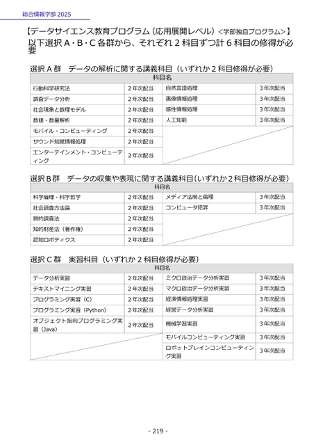 総合情報学部2025【データサイエンス教育プログラム(応用展開レベル)<学部独自プログラム>】以下選択A・B・C各群から、それぞれ2科目ずつ計6科目の修得が必要選択A群データの解析に関する講義科目(いずれか2科目修得が必要)科目名行動科学研究法調査データ分析社会現象と数理モデル数値・数量解析モバイル・コンピューティングサウンド知覚情報処理エンターテインメント・コンピューティング2年次配当2年次配当2年次配当2年次配当2年次配当2年次配当2年次配当自然言語処理画像情報処理感性情報処理人工知能3年次配当3年次配当3年次配当3年次配当選択B群データの収集や表現に関する講義科目(いずれか2科目修得が必要)科目名科学倫理・科学哲学社会調査方法論質的調査法知的財産法(著作権)認知ロボティクス2年次配当2年次配当2年次配当2年次配当2年次配当メディア法制と倫理コンピュータ犯罪3年次配当3年次配当実習科目(いずれか2科目修得が必要)科目名択C群選2年次配当2年次配当2年次配当2年次配当ミクロ政治データ分析実習マクロ政治データ分析実習経済情報処理実習経営データ分析実習2年次配当機械学習実習3年次配当3年次配当3年次配当3年次配当3年次配当モバイルコンピューティング実習3年次配当ロボットブレインコンピューティング実習3年次配当データ分析実習テキストマイニング実習プログラミング実習(C)プログラミング実習(Python)オブジェクト指向プログラミング実習(Java)-219-
