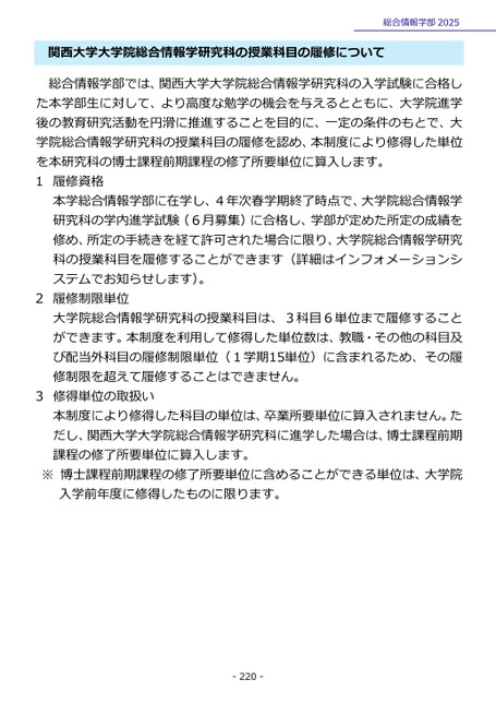 総合情報学部2025関西大学大学院総合情報学研究科の授業科目の履修について総合情報学部では、関西大学大学院総合情報学研究科の入学試験に合格した本学部生に対して、より高度な勉学の機会を与えるとともに、大学院進学後の教育研究活動を円滑に推進することを目的に、一定の条件のもとで、大学院総合情報学研究科の授業科目の履修を認め、本制度により修得した単位を本研究科の博士課程前期課程の修了所要単位に算入します。1履修資格本学総合情報学部に在学し、4年次春学期終了時点で、大学院総合情報学研究科の学内進学試験(6月募集)に合格し、学部が定めた所定の成績を修め、所定の手続きを経て許可された場合に限り、大学院総合情報学研究科の授業科目を履修することができます(詳細はインフォメーションシステムでお知らせします)。2履修制限単位大学院総合情報学研究科の授業科目は、3科目6単位まで履修することができます。本制度を利用して修得した単位数は、教職・その他の科目及び配当外科目の履修制限単位(1学期15単位)に含まれるため、その履修制限を超えて履修することはできません。3修得単位の取扱い本制度により修得した科目の単位は、卒業所要単位に算入されません。ただし、関西大学大学院総合情報学研究科に進学した場合は、博士課程前期課程の修了所要単位に算入します。※博士課程前期課程の修了所要単位に含めることができる単位は、大学院入学前年度に修得したものに限ります。-220-