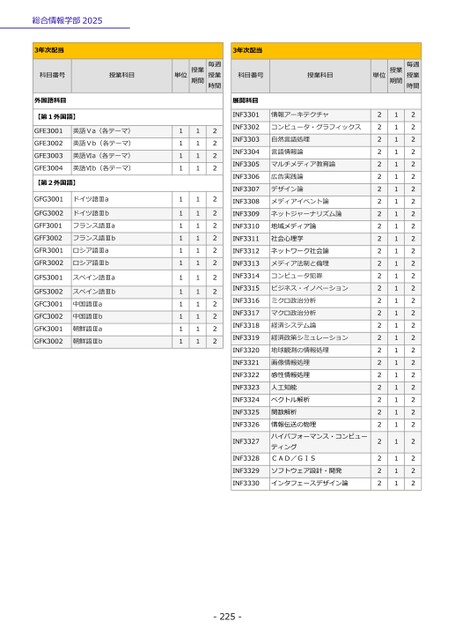 総合情報学部20253年次配当科目番号授業科目外国語科目【第1外国語】GFE3001GFE3002GFE3003GFE3004英語Ⅴa(各テーマ)英語Ⅴb(各テーマ)英語Ⅵa(各テーマ)英語Ⅵb(各テーマ)【第2外国語】GFG3001ドイツ語ⅢaGFG3002ドイツ語ⅢbGFF3001GFF3002フランス語Ⅲaフランス語ⅢbGFR3001ロシア語ⅢaGFR3002ロシア語ⅢbGFS3001スペイン語ⅢaGFS3002GFC3001GFC3002GFK3001GFK3002スペイン語Ⅲb中国語Ⅲa中国語Ⅲb朝鮮語Ⅲa朝鮮語Ⅲb3年次配当科目番号授業科目単位授業期間毎週授業時間単位授業期間毎週授業時間111111111111111111111111111111112222222222222222展開科目INF3301INF3302INF3303INF3304INF3305INF3306INF3307INF3308INF3309INF3310INF3311INF3312INF3313INF3314INF3315INF3316INF3317INF3318INF3319INF3320INF3321INF3322INF3323INF3324INF3325INF3326INF3327INF3328INF3329INF3330情報アーキテクチャコンピュータ・グラフィックス自然言語処理言語情報論マルチメディア教育論広告実践論デザイン論メディアイベント論ネットジャーナリズム論地域メディア論社会心理学ネットワーク社会論メディア法制と倫理コンピュータ犯罪ビジネス・イノベーションミクロ政治分析マクロ政治分析経済システム論経済政策シミュレーション地球観測の情報処理画像情報処理感性情報処理人工知能ベクトル解析関数解析情報伝送の物理ハイパフォーマンス・コンピューティングCAD/GISソフトウェア設計・開発インタフェースデザイン論222222222222222222222222222222111111111111111111111111111111222222222222222222222222222222-225-