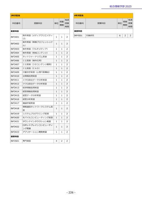 総合情報学部20254年次配当科目番号授業科目演習科目INF4501卒業研究単位授業期間毎週授業時間6223年次配当科目番号授業科目単位授業期間毎週授業時間実習科目INF3401INF3402INF3403INF3404INF3405INF3406INF3407INF3408INF3409INF3410INF3411INF3412INF3413INF3414INF3415INF3416INF3417INF3418INF3419INF3420INF3421INF3422INF3423演習科目制作実習(メディアクリエイティヴ)制作実習(映像プロフェッショナル)制作実習(マルチメディア)制作実習(地域コンテンツ)ネットジャーナリズム実習CG実習(制作応用)CG実習(3Dコンテンツ開発)CG実習(CAD)行動科学実習(心理尺度構成)法情報処理実習ミクロ政治データ分析実習マクロ政治データ分析実習経済情報処理実習経営情報処理実習経営データ分析実習経営分析実習機械学習実習情報通信ネットワークシステム実習システムプログラミング実習モバイルコンピューティング実習サウンドインタラクション実習ロボットブレインコンピューティング実習アプリケーション開発実習INF3501専門演習111111111111111111111114111111111111111111111112222222222222222222222222-226-