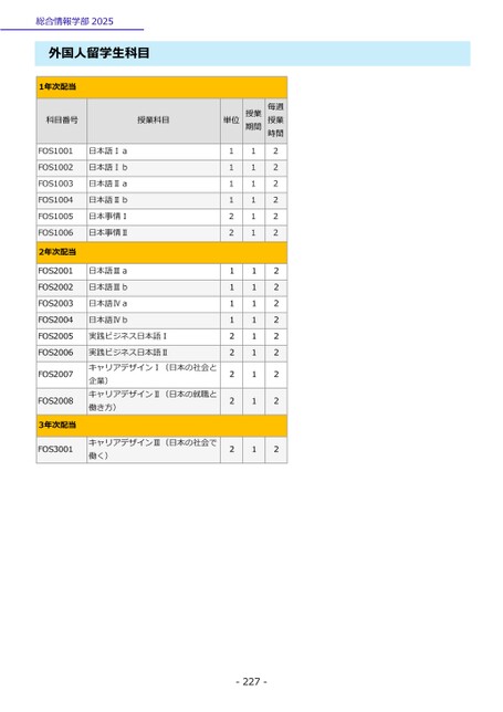 総合情報学部2025外国人留学生科目1年次配当科目番号授業科目FOS1001FOS1002FOS1003FOS1004FOS1005FOS10062年次配当FOS2001FOS2002FOS2003FOS2004FOS2005FOS2006FOS2007FOS20083年次配当FOS3001日本語Ⅰa日本語Ⅰb日本語Ⅱa日本語Ⅱb日本事情Ⅰ日本事情Ⅱ日本語Ⅲa日本語Ⅲb日本語Ⅳa日本語Ⅳb実践ビジネス日本語Ⅰ実践ビジネス日本語ⅡキャリアデザインⅠ(日本の社会と企業)キャリアデザインⅡ(日本の就職と働き方)キャリアデザインⅢ(日本の社会で働く)単位授業期間毎週授業時間111122111122222111111111111111222222222222222-227-