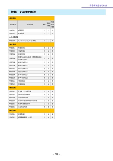 総合情報学部2025教職・その他の科目1年次配当科目番号授業科目INF1601INF1602教職概説教育原理1~3年次配当INF1603インターンシップ(各機関)2年次配当INF2601INF2602INF2603INF2604INF2605INF2606INF2607INF2608INF2609INF2610INF2611INF26123年次配当INF3601INF3602INF3603INF3604INF3605INF36064年次配当INF4601INF4602教育制度論人権教育論教育心理学教育の方法及び技術(情報通信技術の活用を含む)情報科教育法㈠情報科教育法㈡公民科教育法㈠公民科教育法㈡数学科教育法㈠数学科教育法㈡特別活動論教育相談論カリキュラム開発論生徒・進路指導論特別支援教育論総合的な学習の時間の指導法教育実習事前指導社会調査実習教育実習㈡教職実践演習(中等)単位授業期間毎週授業時間222222222222222221112221111111111111111111121122422222222222222222242-228-