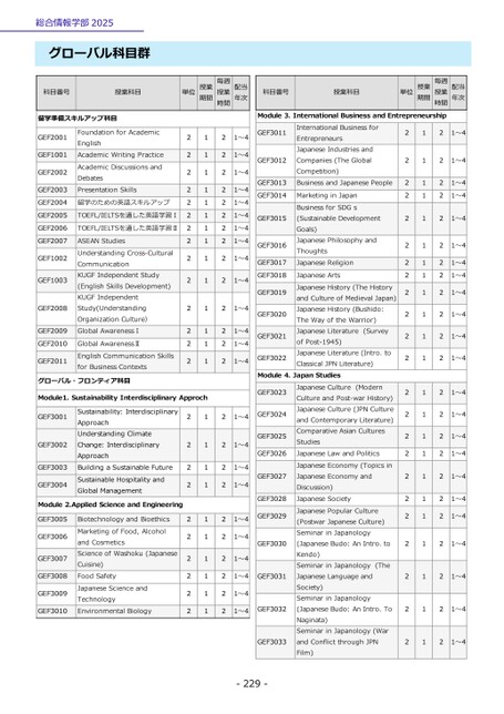 総合情報学部2025グローバル科目群科目番号授業科目単位授業期間毎週授業時間配当年次留学準備スキルアップ科目GEF2001GEF1001GEF2002GEF2003GEF2004GEF2005GEF2006GEF2007GEF1002GEF1003GEF2008GEF2009GEF2010GEF2011FoundationforAcademicEnglishAcademicWritingPracticeAcademicDiscussionsandDebatesPresentationSkills留学のための英語スキルアップTOEFL/IELTSを通した英語学習ⅠTOEFL/IELTSを通した英語学習ⅡASEANStudiesUnderstandingCross-CulturalCommunicationKUGFIndependentStudy(EnglishSkillsDevelopment)KUGFIndependentStudy(UnderstandingOrganizationCulture)GlobalAwarenessⅠGlobalAwarenessⅡEnglishCommunicationSkillsforBusinessContexts2222222222222211111111111111グローバル・フロンティア科目Module1.SustainabilityInterdisciplinaryApprochGEF3001GEF3002GEF3003GEF3004Sustainability:InterdisciplinaryApproachUnderstandingClimateChange:InterdisciplinaryApproachBuildingaSustainableFutureSustainableHospitalityandGlobalManagementModule2.AppliedScienceandEngineeringGEF3005GEF3006GEF3007GEF3008GEF3009GEF3010BiotechnologyandBioethicsMarketingofFood,AlcoholandCosmeticsScienceofWashoku(JapaneseCuisine)FoodSafetyJapaneseScienceandTechnologyEnvironmentalBiology222222222211111111112222222222222222222222221~41~41~41~41~41~41~41~41~41~41~41~41~41~4GEF3011GEF3012GEF3013GEF3014GEF3015GEF3016GEF3017GEF3018GEF3019GEF3020GEF3021GEF3022InternationalBusinessforEntrepreneursJapaneseIndustriesandCompanies(TheGlobalCompetition)BusinessandJapanesePeopleMarketinginJapanBusinessforSDGs(SustainableDevelopmentGoals)JapanesePhilosophyandThoughtsJapaneseReligionJapaneseArtsJapaneseHistory(TheHistoryandCultureofMedievalJapan)JapaneseHistory(Bushido:TheWayoftheWarrior)JapaneseLiterature(SurveyofPost-1945)JapaneseLiterature(Intro.toClassicalJPNLiterature)Module4.JapanStudiesJapaneseCulture(ModernCultureandPost-warHistory)JapaneseCulture(JPNCultureandContemporaryLiterature)ComparativeAsianCulturesStudiesJapaneseLawandPoliticsJapaneseEconomy(TopicsinJapaneseEconomyandDiscussion)JapaneseSocietyJapanesePopularCulture(PostwarJapaneseCulture)SeminarinJapanology(JapaneseBudo:AnIntro.toKendo)SeminarinJapanology(TheJapaneseLanguageandSociety)SeminarinJapanology(JapaneseBudo:AnIntro.ToNaginata)SeminarinJapanology(WarandConflictthroughJPNFilm)GEF30231~4GEF3024GEF3025GEF3026GEF3027GEF3028GEF3029GEF30301~41~41~41~41~41~41~4GEF30311~41~4GEF3032GEF3033-229-科目番号授業科目単位授業期間毎週授業時間配当年次Module3.InternationalBusinessandEntrepreneurship2222222222222222222222211111111111111111111111222222222222222222221~41~41~41~41~41~41~41~41~41~41~41~41~41~41~41~41~41~41~41~421~421~421~4