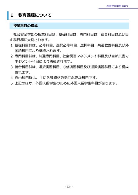 Ⅰ教育課程について授業科目の構成社会安全学部2025社会安全学部の授業科目は、基礎科目群、専門科目群、統合科目群及び自由科目群に大別されます。1基礎科目群は、必修科目、選択必修科目、選択科目、共通教養科目及び外国語科目により構成されます。2専門科目群は、共通専門科目、社会災害マネジメント科目及び自然災害マネジメント科目により構成されます。3統合科目群は、選択実習科目、必修演習科目及び選択演習科目により構成されます。4自由科目群は、主に各種資格取得に必要な科目です。5上記のほか、外国人留学生のために外国人留学生科目があります。-234-