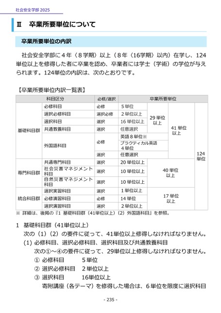 社会安全学部2025Ⅱ卒業所要単位について卒業所要単位の内訳社会安全学部に4年〈8学期〉以上(8年〈16学期〉以内)在学し、124単位以上を修得した者に卒業を認め、卒業者には学士(学術)の学位が与えられます。124単位の内訳は、次のとおりです。卒業所要単位29単位以上5単位2単位以上16単位以上任意選択英語8単位※プラクティカル英語4単位任意選択20単位以上41単位以上124単位10単位以上10単位以上1単位以上14単位2単位以上40単位以上17単位以上必修/選択必修選択必修選択選択必修選択選択選択選択選択必修選択卒業所要単位内訳一覧表】【科目区分必修科目選択必修科目選択科目共通教養科目外国語科目基礎科目群専門科目群統合科目群共通専門科目社会災害マネジメント科目自然災害マネジメント科目選択実習科目必修演習科目選択演習科目※詳細は、後掲の『1基礎科目群(41単位以上)(2)外国語科目』を参照。1基礎科目群(41単位以上)次の(1)(2)の要件に従って、41単位以上修得しなければなりません。(1)必修科目、選択必修科目、選択科目及び共通教養科目次の①~④の要件に従って、29単位以上修得しなければなりません。①必修科目②選択必修科目2単位以上16単位以上③選択科目5単位寄附講座(各テーマ)を修得した場合は、6単位を限度に選択科目-235-