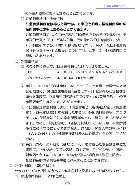 の卒業所要単位の中に含めることができます。④共通教養科目任意選択社会安全学部2025共通教養科目を修得した場合は、8単位を限度に基礎科目群の卒業所要単位の中に含めることができます。共通教養科目には、グローバル科目群等を含みます(後掲の『Ⅴ授業科目一覧:グローバル科目群、その他の科目』を参照)。グローバル科目群のうち、「海外研修(各セミナー)」及び「外国語運用実習(各セミナー)」の取扱いについては、以下(2)外国語科目に記載のとおりです。(2)外国語科目①次の要件に従って、12単位修得しなければなりません。英語Ⅰa、Ⅰb、Ⅱa、Ⅱb、Ⅲa、Ⅲb、Ⅳa、Ⅳbの計8単位プラクティカル英語Ⅰa、Ⅰb、Ⅱa、Ⅱbの計4単位②英語についての「海外研修(各セミナー)」を修得した場合は2単位を限度に、「外国語運用実習(各セミナー)」を修得した場合は1単位を限度に、外国語科目英語(プラクティカル英語を除く)の卒業所要単位に算入することができます。③外国語検定認定制度により、「検定認定2(各検定試験)」「検定認定3(各検定試験)」を修得した場合は、外国語科目英語(プラクティカル英語を除く)の卒業所要単位として算入することができます。ただし、「検定認定1(各検定試験)」については、卒業所要単位に算入することができません。詳細は、関西大学教務ガイド「KAN-CAN!」の『外国語検定試験の単位認定』を参照してください。④英語以外の「海外研修(各セミナー)」を修得した場合は2単位を限度に、ドイツ語、フランス語、ロシア語、スペイン語、中国語、朝鮮語の各Ⅰa、Ⅰb、Ⅱa、Ⅱbを修得した場合は4単位を限度に、基礎科目群の卒業所要単位に算入することができます。2専門科目群(40単位以上)次の(1)~(3)の要件に従って、40単位以上修得しなければなりません。(1)共通専門科目20単位以上-236-