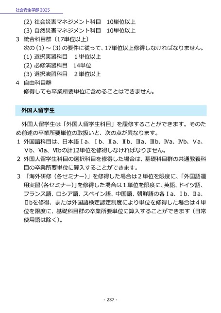 社会安全学部2025(2)社会災害マネジメント科目10単位以上(3)自然災害マネジメント科目10単位以上3統合科目群(17単位以上)次の(1)~(3)の要件に従って、17単位以上修得しなければなりません。(1)選択実習科目1単位以上(2)必修演習科目14単位(3)選択演習科目2単位以上4自由科目群修得しても卒業所要単位に含めることはできません。国人留学生外外国人留学生は「外国人留学生科目」を履修することができます。そのため前述の卒業所要単位の取扱いと、次の点が異なります。1外国語科目は、日本語Ⅰa、Ⅰb、Ⅱa、Ⅱb、Ⅲa、Ⅲb、Ⅳa、Ⅳb、Ⅴa、Ⅴb、Ⅵa、Ⅵbの計12単位を修得しなければなりません。2外国人留学生科目の選択科目を修得した場合は、基礎科目群の共通教養科目の卒業所要単位に算入することができます。3「海外研修(各セミナー)」を修得した場合は2単位を限度に、「外国語運用実習(各セミナー)」を修得した場合は1単位を限度に、英語、ドイツ語、フランス語、ロシア語、スペイン語、中国語、朝鮮語の各Ⅰa、Ⅰb、Ⅱa、Ⅱbを修得、または外国語検定認定制度により単位を修得した場合は4単位を限度に、基礎科目群の卒業所要単位に算入することができます(日常使用語は除く)。-237-