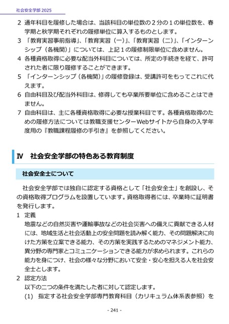 社会安全学部20252通年科目を履修した場合は、当該科目の単位数の2分の1の単位数を、春学期と秋学期それぞれの履修単位に算入するものとします。3「教育実習事前指導」、「教育実習(一)」、「教育実習(二)」、「インターンシップ(各機関)」については、上記1の履修制限単位に含めません。4各種資格取得に必要な配当外科目については、所定の手続きを経て、許可された者に限り履修することができます。5「インターンシップ(各機関)」の履修登録は、受講許可をもってこれに代えます。6自由科目及び配当外科目は、修得しても卒業所要単位に含めることはできません。7自由科目は、主に各種資格取得に必要な授業科目です。各種資格取得のための履修方法については教職支援センターWebサイトから自身の入学年度用の『教職課程履修の手引き』を参照してください。社会安全学部の特色ある教育制度Ⅳ社会安全士について社会安全学部では独自に認定する資格として「社会安全士」を創設し、その資格取得プログラムを設置しています。資格取得者には、卒業時に証明書を発行します。1定義地震などの自然災害や運輸事故などの社会災害への備えに貢献できる人材には、地域生活と社会活動上の安全問題を読み解く能力、その問題解決に向けた方策を立案できる能力、その方策を実践するためのマネジメント能力、異分野の専門家とコミュニケーションできる能力が求められます。これらの能力を身につけ、社会の様々な分野において安全・安心を担える人を社会安全士とします。認定方法以下の二つの条件を満たした者に対して認定します。(1)指定する社会安全学部専門教育科目(カリキュラム体系表参照)を2-241-