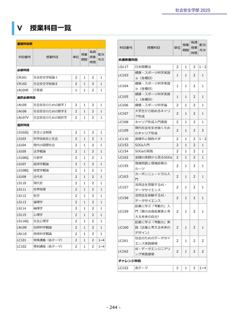 Ⅴ授業科目一覧社会安全学部2025単位授業期間毎週授業時間配当年次科目番号授業科目共通教養科目単位授業期間毎週授業時間配当年次211122222222222222222111111111111111111111222222222222222222221・211111121・21111111112221~4221222222222222222222222211111111111111111111111112222222222222222222222222111111111111111111111111~41~4LS117LC103LC104LC105LC106LC107LC108LC109LC110LC153LC154LC162LC155LC163LC157LC158LC159LC160LC161LC162日本国憲法健康・スポーツ科学実習a(各種目)健康・スポーツ科学実習b(各種目)健康・スポーツ科学実習c(各種目)健康・スポーツ科学論大学生から始めるキャリア形成キャリア形成入門演習現代社会を生き抜くためのキャリア形成高槻市と関西大学SDGs入門SDGsの実践金融の実務から見るSDGs環境問題と環境政策のルーツカーボンニュートラル入門活用法を見聞するAI・データサイエンス活用法を体験するAI・データサイエンス起業に学ぶ「考動力」入門(関大出身起業家と考える未来の自分)起業に学ぶ「考動力」実践(企業と考える未来のデザイン)社会のためのデータサイエンス実践基礎AI・データエンジニアリング実践基礎各テーマLC152チャレンジ科目-244-基礎科目群科目番号授業科目必修科目CR101CR102社会安全学総論Ⅰ社会安全学総論ⅡLN104EIT実習選択必修科目LN105LN106社会安全のための数学Ⅰ社会安全のための数学ⅡLN107V社会安全のための統計学選択科目LS102Q安全と法制度LS103LS104LS105科学技術史と社会現代の国際社会法学概論LS106Q行政学LS107経済学概論LS108Q経営学概論LS109LS110LS111LS112LS113LS114LS115近代史現代史世界地理哲学論理学倫理学心理学LS116Q社会心理学LN109LN110LC101LC102自然科学概論地球科学概論特殊講義(各テーマ)寄附講座(各テーマ)