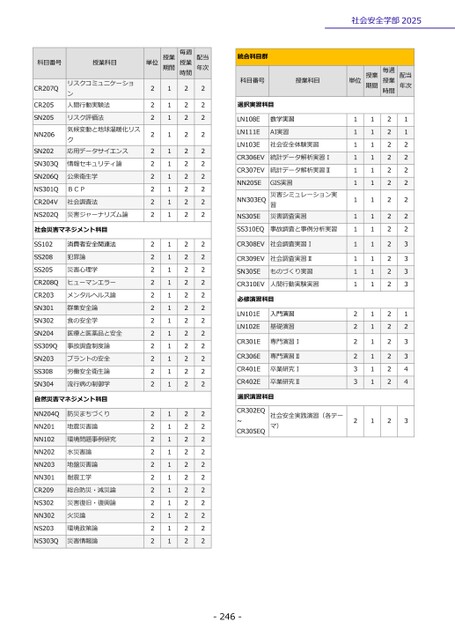 -246-社会安全学部2025科目番号授業科目単位期間授業時間毎週授業年次配当CR207Q人間行動実験法リスクコミュニケーション2122CR2052122SN205応用データサイエンス気候変動と地球温暖化リスリスク評価法ク2122NN2062122SN2022122SN303Q情報セキュリティ論2122SN206Q公衆衛生学2122NS301QBCP2122CR204V社会調査法2122NS202Q災害ジャーナリズム論2122社会災害マネジメント科目SS102消費者安全関連法2122SS208犯罪論2122SS205災害心理学2122CR208Qヒューマンエラー2122CR203メンタルヘルス論2122SN301群集安全論2122SN302食の安全学2122SN204医療と医薬品と安全2122SS309Q事故調査制度論2122SN203プラントの安全2122SS308労働安全衛生論2122SN304流行病の制御学2122自然災害マネジメント科目NN204Q防災まちづくり2122NN201地震災害論2122NN102環境問題事例研究2122NN202水災害論2122NN203地盤災害論2122NN301耐震工学2122CR209総合防災・減災論2122NS302災害復旧・復興論2122NN302火災論2122NS203環境政策論2122NS303Q災害情報論2122統合科目群科目番号授業科目単位授業期間授業毎週時間配当年次選択実習科目LN108E数学実習1121LN111EAI実習1121LN103E社会安全体験実習1122CR306EV統計データ解析実習Ⅰ1122CR307EV統計データ解析実習Ⅱ1122NN205E習災害シミュレーション実GIS実習災害調査実習1122NN303EQ1122NS305E1122SS310EQ事故調査と事例分析実習1122CR308EV社会調査実習Ⅰ1123CR309EV社会調査実習Ⅱ1123SN305Eものづくり実習1123CR310EV人間行動実験実習1123必修演習科目LN101E入門演習2121LN102E基礎演習2122CR301E専門演習Ⅰ2123CR306E専門演習Ⅱ2123CR401E卒業研究Ⅰ3124CR402E卒業研究Ⅱ3124選択演習科目CR302EQ~CR305EQ社会安全実践演習(各テーマ)2123