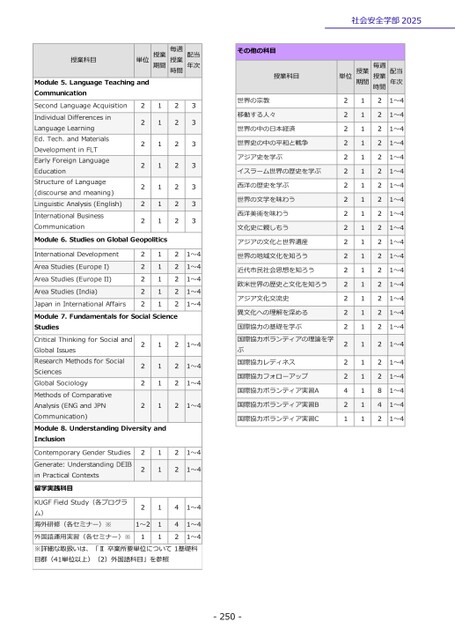 社会安全学部2025単位授業期間毎週授業時間222222222222222222224211111111111111111111111122222222222222222222842配当年次1~41~41~41~41~41~41~41~41~41~41~41~41~41~41~41~41~41~41~41~41~41~41~4その他の科目授業科目世界の宗教移動する人々世界の中の日本経済世界史の中の平和と戦争アジア史を学ぶイスラーム世界の歴史を学ぶ西洋の歴史を学ぶ世界の文学を味わう西洋美術を味わう文化史に親しもうアジアの文化と世界遺産世界の地域文化を知ろう近代市民社会思想を知ろう欧米世界の歴史と文化を知ろうアジア文化交流史異文化への理解を深める国際協力の基礎を学ぶ国際協力ボランティアの理論を学ぶ国際協力レディネス国際協力フォローアップ国際協力ボランティア実習A国際協力ボランティア実習B国際協力ボランティア実習C-250-授業科目単位授業期間毎週授業時間配当年次Module5.LanguageTeachingandCommunicationSecondLanguageAcquisitionIndividualDifferencesinLanguageLearningEd.Tech.andMaterialsDevelopmentinFLTEarlyForeignLanguageEducationStructureofLanguage(discourseandmeaning)LinguisticAnalysis(English)InternationalBusinessCommunication22222221111111Module6.StudiesonGlobalGeopoliticsInternationalDevelopmentAreaStudies(EuropeI)AreaStudies(EuropeII)AreaStudies(India)JapaninInternationalAffairs2222211111222222222222Module7.FundamentalsforSocialScienceStudies1212CriticalThinkingforSocialandGlobalIssuesResearchMethodsforSocialSciencesGlobalSociologyMethodsofComparativeAnalysis(ENGandJPNCommunication)Module8.UnderstandingDiversityandInclusion1221ContemporaryGenderStudiesGenerate:UnderstandingDEIBinPracticalContexts留学実践科目KUGFFieldStudy(各プログラム)海外研修(各セミナー)※2221~211112222224433333331~41~41~41~41~41~41~41~41~41~41~41~41~4外国語運用実習(各セミナー)※※詳細な取扱いは、「Ⅱ卒業所要単位について1基礎科目群(41単位以上)(2)外国語科目」を参照1121~4