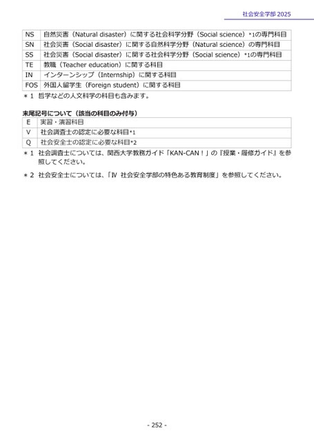 社会安全学部2025自然災害(Naturaldisaster)に関する社会科学分野(Socialscience)*1の専門科目社会災害(Socialdisaster)に関する自然科学分野(Naturalscience)の専門科目社会災害(Socialdisaster)に関する社会科学分野(Socialscience)*1の専門科目教職(Teachereducation)に関する科目インターンシップ(Internship)に関する科目外国人留学生(Foreignstudent)に関する科目NSSNSSTEINFOS*1哲学などの人文科学の科目も含みます。尾記号について(該当の科目のみ付与)末実習・演習科目社会調査士の認定に必要な科目*1社会安全士の認定に必要な科目*2EVQ*1社会調査士については、関西大学教務ガイド「KAN-CAN!」の『授業・履修ガイド』を参照してください。*2社会安全士については、「Ⅳ社会安全学部の特色ある教育制度」を参照してください。-252-