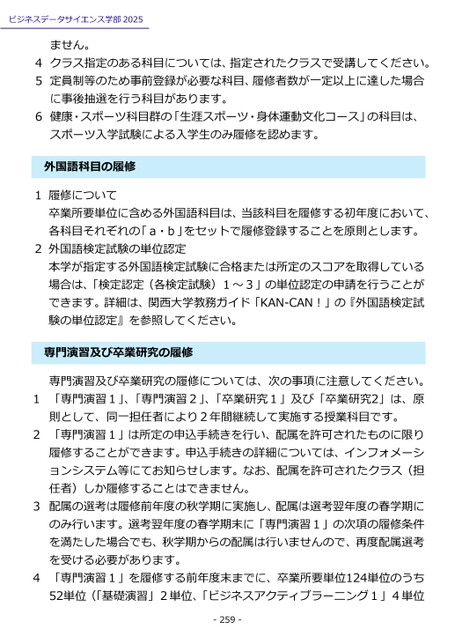 ビジネスデータサイエンス学部2025ません。4クラス指定のある科目については、指定されたクラスで受講してください。5定員制等のため事前登録が必要な科目、履修者数が一定以上に達した場合に事後抽選を行う科目があります。6健康・スポーツ科目群の「生涯スポーツ・身体運動文化コース」の科目は、スポーツ入学試験による入学生のみ履修を認めます。国語科目の履修外1履修について卒業所要単位に含める外国語科目は、当該科目を履修する初年度において、各科目それぞれの「a・b」をセットで履修登録することを原則とします。2外国語検定試験の単位認定本学が指定する外国語検定試験に合格または所定のスコアを取得している場合は、「検定認定(各検定試験)1~3」の単位認定の申請を行うことができます。詳細は、関西大学教務ガイド「KAN-CAN!」の『外国語検定試験の単位認定』を参照してください。門演習及び卒業研究の履修専専門演習及び卒業研究の履修については、次の事項に注意してください。1「専門演習1」、「専門演習2」、「卒業研究1」及び「卒業研究2」は、原則として、同一担任者により2年間継続して実施する授業科目です。2「専門演習1」は所定の申込手続きを行い、配属を許可されたものに限り履修することができます。申込手続きの詳細については、インフォメーションシステム等にてお知らせします。なお、配属を許可されたクラス(担任者)しか履修することはできません。3配属の選考は履修前年度の秋学期に実施し、配属は選考翌年度の春学期にのみ行います。選考翌年度の春学期末に「専門演習1」の次項の履修条件を満たした場合でも、秋学期からの配属は行いませんので、再度配属選考を受ける必要があります。4「専門演習1」を履修する前年度末までに、卒業所要単位124単位のうち52単位(「基礎演習」2単位、「ビジネスアクティブラーニング1」4単位-259-