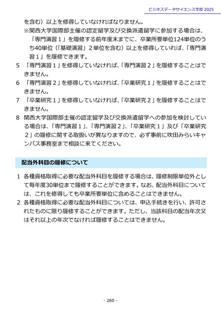 ビジネスデータサイエンス学部2025を含む)以上を修得していなければなりません。※関西大学国際部主催の認定留学及び交換派遣留学に参加する場合は、「専門演習1」を履修する前年度末までに、卒業所要単位124単位のうち40単位(「基礎演習」2単位を含む)以上を修得していれば、「専門演習1」を履修できます。5「専門演習1」を修得していなければ、「専門演習2」を履修することはできません。6「専門演習2」を修得していなければ、「卒業研究1」を履修することはできません。7「卒業研究1」を修得していなければ、「卒業研究2」を履修することはできません。8関西大学国際部主催の認定留学及び交換派遣留学への参加を検討している場合は、「専門演習1」、「専門演習2」、「卒業研究1」及び「卒業研究2」の履修に関する取扱いが異なりますので、必ず事前に吹田みらいキャンパス事務室まで相談に来てください。当外科目の履修について配1各種資格取得に必要な配当外科目を履修する場合は、履修制限単位外として毎年度30単位まで履修することができます。なお、配当外科目については、これを修得しても卒業所要単位に含めることはできません。2各種資格取得に必要な配当外科目については、申込手続きを行い、許可されたものに限り履修することができます。ただし、当該科目の配当年次又はそれ以上の年次でなければ履修することはできません。-260-