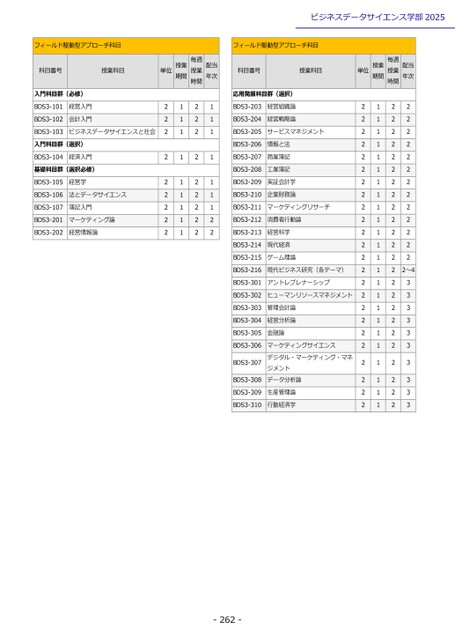 科目番号授業科目応用発展科目群(選択)BDS3-203経営組織論BDS3-204経営戦略論BDS3-205サービスマネジメントBDS3-206情報と法BDS3-207商業簿記BDS3-208工業簿記BDS3-209実証会計学BDS3-210企業財務論BDS3-211マーケティングリサーチBDS3-212消費者行動論BDS3-213経営科学BDS3-214現代経済BDS3-215ゲーム理論BDS3-216現代ビジネス研究(各テーマ)BDS3-301アントレプレナーシップBDS3-302ヒューマンリソースマネジメントBDS3-303管理会計論BDS3-304経営分析論BDS3-305金融論BDS3-306BDS3-307BDS3-308マーケティングサイエンスデジタル・マーケティング・マネジメントデータ分析論BDS3-309生産管理論BDS3-310行動経済学単位授業期間毎週授業時間配当年次22222222222222222222222211111111111111111111111122222222222222222222222222222222222222~43333333333-262-ビジネスデータサイエンス学部2025フィールド駆動型アプローチ科目フィールド駆動型アプローチ科目科目番号授業科目入門科目群(必修)BDS3-101経営入門BDS3-102会計入門BDS3-103ビジネスデータサイエンスと社会入門科目群(選択)BDS3-104経済入門基礎科目群(選択必修)BDS3-105経営学BDS3-106法とデータサイエンスBDS3-107簿記入門BDS3-201マーケティング論BDS3-202経営情報論単位授業期間毎週授業時間配当年次222222222111111111222222222111111122