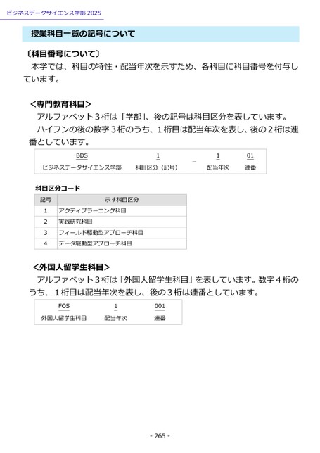 ビジネスデータサイエンス学部2025授業科目一覧の記号について〔科目番号について〕本学では、科目の特性・配当年次を示すため、各科目に科目番号を付与しています。<専門教育科目>アルファベット3桁は「学部」、後の記号は科目区分を表しています。ハイフンの後の数字3桁のうち、1桁目は配当年次を表し、後の2桁は連番としています。BDS1ビジネスデータサイエンス学部科目区分(記号)-1配当年次01連番科目区分コード記号1234示す科目区分アクティブラーニング科目実践研究科目フィールド駆動型アプローチ科目データ駆動型アプローチ科目<外国人留学生科目>アルファベット3桁は「外国人留学生科目」を表しています。数字4桁のうち、1桁目は配当年次を表し、後の3桁は連番としています。FOS1外国人留学生科目配当年次001連番-265-