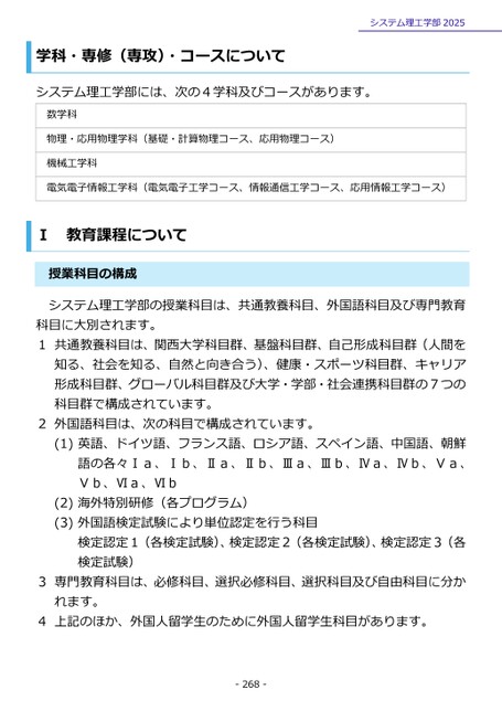 学科・専修(専攻)・コースについてシステム理工学部2025システム理工学部には、次の4学科及びコースがあります。数学科物理・応用物理学科(基礎・計算物理コース、応用物理コース)機械工学科電気電子情報工学科(電気電子工学コース、情報通信工学コース、応用情報工学コース)教育課程についてⅠ授業科目の構成システム理工学部の授業科目は、共通教養科目、外国語科目及び専門教育科目に大別されます。1共通教養科目は、関西大学科目群、基盤科目群、自己形成科目群(人間を知る、社会を知る、自然と向き合う)、健康・スポーツ科目群、キャリア形成科目群、グローバル科目群及び大学・学部・社会連携科目群の7つの科目群で構成されています。2外国語科目は、次の科目で構成されています。(1)英語、ドイツ語、フランス語、ロシア語、スペイン語、中国語、朝鮮語の各々Ⅰa、Ⅰb、Ⅱa、Ⅱb、Ⅲa、Ⅲb、Ⅳa、Ⅳb、Ⅴa、Ⅴb、Ⅵa、Ⅵb(2)海外特別研修(各プログラム)(3)外国語検定試験により単位認定を行う科目検定認定1(各検定試験)、検定認定2(各検定試験)、検定認定3(各検定試験)3専門教育科目は、必修科目、選択必修科目、選択科目及び自由科目に分かれます。4上記のほか、外国人留学生のために外国人留学生科目があります。-268-