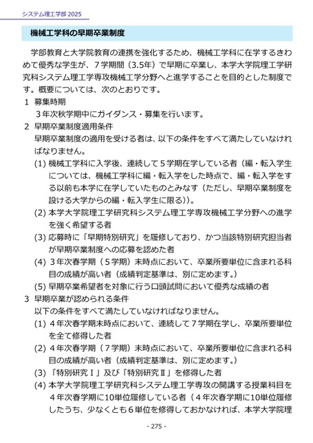 システム理工学部2025機械工学科の早期卒業制度学部教育と大学院教育の連携を強化するため、機械工学科に在学するきわめて優秀な学生が、7学期間(3.5年)で早期に卒業し、本学大学院理工学研究科システム理工学専攻機械工学分野へと進学することを目的とした制度です。概要については、次のとおりです。1募集時期3年次秋学期中にガイダンス・募集を行います。2早期卒業制度適用条件早期卒業制度の適用を受ける者は、以下の条件をすべて満たしていなければなりません。(1)機械工学科に入学後、連続して5学期在学している者(編・転入学生については、機械工学科に編・転入学をした時点で、編・転入学をする以前も本学に在学していたものとみなす(ただし、早期卒業制度を設ける大学からの編・転入学生に限る))。(2)本学大学院理工学研究科システム理工学専攻機械工学分野への進学を強く希望する者(3)応募時に「早期特別研究」を履修しており、かつ当該特別研究担当者が早期卒業制度への応募を認めた者(4)3年次春学期(5学期)末時点において、卒業所要単位に含まれる科目の成績が高い者(成績判定基準は、別に定めます。)(5)早期卒業希望者を対象に行う口頭試問において優秀な成績の者3早期卒業が認められる条件以下の条件をすべて満たしていなければなりません。(1)4年次春学期末時点において、連続して7学期在学し、卒業所要単位を全て修得した者(2)4年次春学期(7学期)末時点において、卒業所要単位に含まれる科目の成績が高い者(成績判定基準は、別に定めます。)(3)「特別研究Ⅰ」及び「特別研究Ⅱ」を修得した者(4)本学大学院理工学研究科システム理工学専攻の開講する授業科目を4年次春学期に10単位履修している者(4年次春学期に10単位履修したうち、少なくとも6単位を修得しておかなければ、本学大学院理-275-