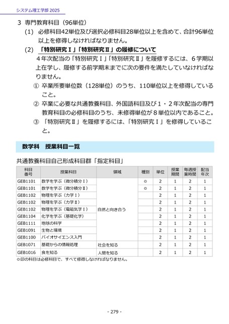 システム理工学部20253専門教育科目(96単位)(1)(2)必修科目42単位及び選択必修科目28単位以上を含めて、合計96単位以上を修得しなければなりません。「特別研究Ⅰ」「特別研究Ⅱ」の履修について4年次配当の「特別研究Ⅰ」「特別研究Ⅱ」を履修するには、6学期以上在学し、履修する前学期末までに次の要件を満たしていなければなりません。①卒業所要単位数(128単位)のうち、110単位以上を修得していること。②卒業に必要な共通教養科目、外国語科目及び1・2年次配当の専門教育科目の必修科目のうち、未修得単位が8単位以内であること。③「特別研究Ⅱ」を履修するには、「特別研究Ⅰ」を修得していること。数学科授業科目一覧共通教養科目自己形成科目群「指定科目」科目番号授業科目領域種別単位授業期間毎週授業時間配当年次◎◎22222222222111111111112222222222211111111111GEB1101GEB1101GEB1102GEB1102GEB1102GEB1104GEB1111GEB1091GEB1100GEB1071GEB1016◎印の科目は必修科目で、すべて修得しなければなりません。数学を学ぶ(微分積分Ⅰ)数学を学ぶ(微分積分Ⅱ)物理を学ぶ(力学Ⅰ)物理を学ぶ(力学Ⅱ)物理を学ぶ(電磁気学Ⅰ)化学を学ぶ(基礎化学)地球の科学生物と環境バイオサイエンス入門基礎からの情報処理食を知る自然と向き合う社会を知る人間を知る-279-