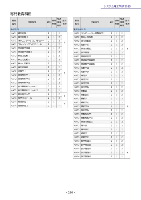 専門教育科目科目番号授業科目必修科目MAT1線形代数ⅠMAT1MAT1MAT1線形代数ⅡオリエンテーションゼミナーフレッシュマンゼミナールMAT1基礎数学演義ⅠMAT1基礎数学演義ⅡMAT2集合と位相ⅠMAT2集合と位相ⅡMAT2集合と位相ⅢMAT2線形代数ⅢMAT2代数学ⅠMAT2基礎解析学ⅠMAT2基礎解析学ⅡMAT2基礎解析学ⅢMAT2数学基礎ゼミナールⅠMAT2数学基礎ゼミナールⅡMAT3現代数学入門MAT3専門ゼミナールMAT4特別研究ⅠMAT4特別研究Ⅱ単位授業期間毎週授業時間配当年次2222222222222222223311111111111111111111222222222222222222--1234システム理工学部2025科目番号選択必修科目授業科目MAT2コンピューター実験数学ⅠMAT2集合と位相ⅣMAT2線形代数ⅣMAT2代数学ⅡMAT2微分方程式ⅠMAT2数学特論ⅠMAT2基礎統計学MAT2基礎数学演義ⅢMAT2基礎数学演義ⅣMAT3代数学ⅢMAT3代数学ⅣMAT3幾何学ⅠMAT3幾何学ⅡMAT3幾何学ⅢMAT3幾何学ⅣMAT3関数論ⅠMAT3関数論ⅡMAT3解析学ⅠMAT3解析学ⅡMAT3解析学ⅢMAT3解析学ⅣMAT3関数解析学ⅠMAT3関数解析学ⅡMAT3微分方程式ⅡMAT3確率論ⅠMAT3確率論ⅡMAT3統計学ⅠMAT3統計学ⅡMAT3数学特論ⅡMAT3数学特論ⅢMAT4数学特論ⅣMAT4数学特論ⅤMAT4数学特論Ⅵ単位授業期間毎週授業時間配当年次222222222222222222222222222222222111111111111111111111111111111111222222222222222222222222222222222234-280-