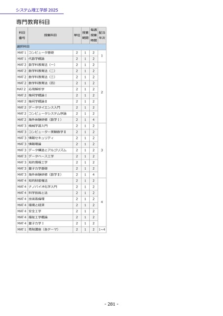 システム理工学部2025専門教育科目科目番号選択科目授業科目単位授業期間毎週授業時間配当年次MAT1コンピュータ基礎MAT1代数学概論MAT2数学科教育法(一)MAT2数学科教育法(二)MAT2数学科教育法(三)MAT2数学科教育法(四)MAT2応用解析学MAT2幾何学概論ⅠMAT2幾何学概論ⅡMAT2データサイエンス入門MAT2コンピュータシステム序論MAT2海外体験研修(数学Ⅰ)MAT3機械学習入門MAT3コンピューター実験数学ⅡMAT3情報セキュリティMAT3情報理論MAT3データ構造とアルゴリズムMAT3データベース工学MAT3知的情報工学MAT3量子力学基礎MAT3海外体験研修(数学Ⅱ)MAT4知的財産権法MAT4ナノバイオ化学入門MAT4科学技術と法MAT4技術者倫理MAT4環境と経済MAT4安全工学MAT4福祉工学概論MAT4量子力学ⅠMAT1寄附講座(各テーマ)22222222222222222222222222222211111111111111111111111111111122222222222422222222422222222212341~4-281-