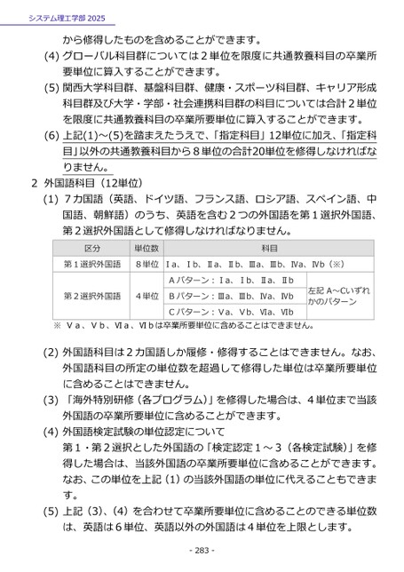 システム理工学部2025から修得したものを含めることができます。(4)グローバル科目群については2単位を限度に共通教養科目の卒業所要単位に算入することができます。(5)関西大学科目群、基盤科目群、健康・スポーツ科目群、キャリア形成科目群及び大学・学部・社会連携科目群の科目については合計2単位を限度に共通教養科目の卒業所要単位に算入することができます。(6)上記(1)~(5)を踏まえたうえで、「指定科目」12単位に加え、「指定科目」以外の共通教養科目から8単位の合計20単位を修得しなければなりません。2外国語科目(12単位)(1)7カ国語(英語、ドイツ語、フランス語、ロシア語、スペイン語、中国語、朝鮮語)のうち、英語を含む2つの外国語を第1選択外国語、第2選択外国語として修得しなければなりません。区分単位数科目第1選択外国語8単位Ⅰa、Ⅰb、Ⅱa、Ⅱb、Ⅲa、Ⅲb、Ⅳa、Ⅳb(※)Aパターン:Ⅰa、Ⅰb、Ⅱa、Ⅱb第2選択外国語4単位Bパターン:Ⅲa、Ⅲb、Ⅳa、ⅣbCパターン:Ⅴa、Ⅴb、Ⅵa、Ⅵb左記A~Ⅽいずれかのパターン※Ⅴa、Ⅴb、Ⅵa、Ⅵbは卒業所要単位に含めることはできません。2)外国語科目は2カ国語しか履修・修得することはできません。なお、(外国語科目の所定の単位数を超過して修得した単位は卒業所要単位に含めることはできません。(3)「海外特別研修(各プログラム)」を修得した場合は、4単位まで当該外国語の卒業所要単位に含めることができます。(4)外国語検定試験の単位認定について第1・第2選択とした外国語の「検定認定1~3(各検定試験)」を修得した場合は、当該外国語の卒業所要単位に含めることができます。なお、この単位を上記(1)の当該外国語の単位に代えることもできます。(5)上記(3)、(4)を合わせて卒業所要単位に含めることのできる単位数は、英語は6単位、英語以外の外国語は4単位を上限とします。-283-