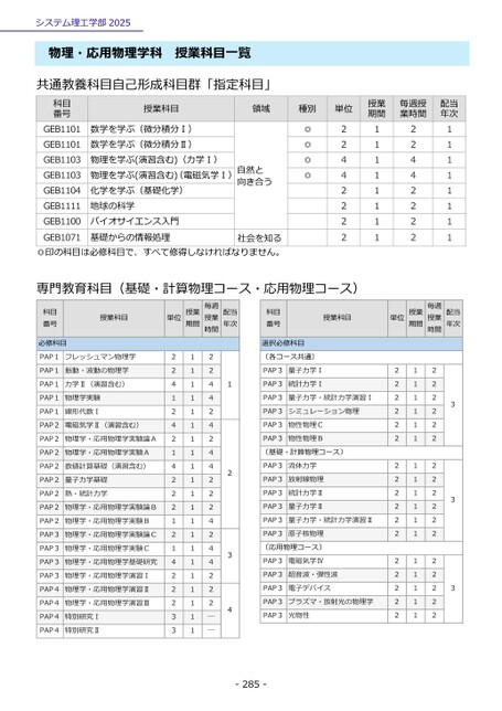 システム理工学部2025物理・応用物理学科授業科目一覧共通教養科目自己形成科目群「指定科目」科目番号授業科目領域種別単位授業期間毎週授業時間配当年次GEB1101GEB1101GEB1103GEB1103GEB1104GEB1111GEB1100GEB1071数学を学ぶ(微分積分Ⅰ)数学を学ぶ(微分積分Ⅱ)物理を学ぶ(演習含む)(力学Ⅰ)物理を学ぶ(演習含む)(電磁気学Ⅰ)化学を学ぶ(基礎化学)地球の科学バイオサイエンス入門基礎からの情報処理自然と向き合う◎◎◎◎22442222111111112244222211111111門教育科目(基礎・計算物理コース・応用物理コース)専社会を知る◎印の科目は必修科目で、すべて修得しなければなりません。科目番号必修科目授業科目単位授業期間毎週授業時間配当年次科目番号授業科目単位授業期間毎週授業時間配当年次PAP1フレッシュマン物理学PAP1振動・波動の物理学PAP1力学Ⅱ(演習含む)PAP1物理学実験PAP1線形代数ⅠPAP2電磁気学Ⅱ(演習含む)PAP2物理学・応用物理学実験論APAP2物理学・応用物理学実験APAP2数値計算基礎(演習含む)PAP2量子力学基礎PAP2熱・統計力学PAP2物理学・応用物理学実験論BPAP2物理学・応用物理学実験BPAP3物理学・応用物理学実験論CPAP3物理学・応用物理学実験CPAP3物理学・応用物理学基礎研究PAP3物理学・応用物理学演習ⅠPAP4物理学・応用物理学演習ⅡPAP4物理学・応用物理学演習ⅢPAP4特別研究ⅠPAP4特別研究Ⅱ2241242142221214222331111111111111111111112244242442224244222――1234選択必修科目〔各コース共通〕PAP3量子力学ⅠPAP3統計力学ⅠPAP3量子力学・統計力学演習ⅠPAP3シミュレーション物理PAP3物性物理CPAP3物性物理B〔基礎・計算物理コース〕PAP3流体力学PAP3放射線物理PAP3統計力学ⅡPAP3量子力学ⅡPAP3量子力学・統計力学演習ⅡPAP3原子核物理〔応用物理コース〕PAP3電磁気学ⅣPAP3超音波・弾性波PAP3電子デバイスPAP3プラズマ・放射光の物理学PAP3光物性-285-222222222222222221111111111111111122222222222222222333