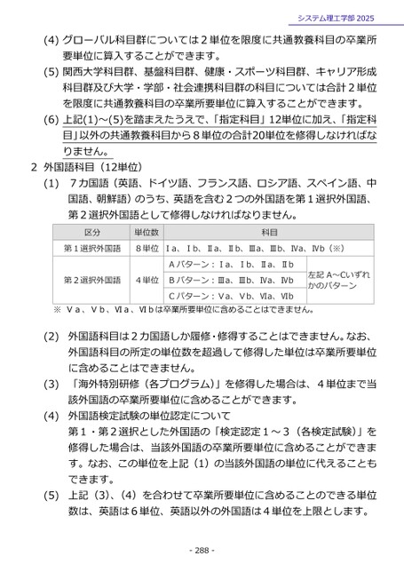 システム理工学部2025(4)グローバル科目群については2単位を限度に共通教養科目の卒業所要単位に算入することができます。(5)関西大学科目群、基盤科目群、健康・スポーツ科目群、キャリア形成科目群及び大学・学部・社会連携科目群の科目については合計2単位を限度に共通教養科目の卒業所要単位に算入することができます。(6)上記(1)~(5)を踏まえたうえで、「指定科目」12単位に加え、「指定科目」以外の共通教養科目から8単位の合計20単位を修得しなければなりません。2外国語科目(12単位)(1)7カ国語(英語、ドイツ語、フランス語、ロシア語、スペイン語、中国語、朝鮮語)のうち、英語を含む2つの外国語を第1選択外国語、第2選択外国語として修得しなければなりません。区分単位数科目第1選択外国語8単位Ⅰa、Ⅰb、Ⅱa、Ⅱb、Ⅲa、Ⅲb、Ⅳa、Ⅳb(※)Aパターン:Ⅰa、Ⅰb、Ⅱa、Ⅱb第2選択外国語4単位Bパターン:Ⅲa、Ⅲb、Ⅳa、ⅣbCパターン:Ⅴa、Ⅴb、Ⅵa、Ⅵb左記A~Ⅽいずれかのパターン※Ⅴa、Ⅴb、Ⅵa、Ⅵbは卒業所要単位に含めることはできません。外国語科目は2カ国語しか履修・修得することはできません。なお、外国語科目の所定の単位数を超過して修得した単位は卒業所要単位に含めることはできません。「海外特別研修(各プログラム)」を修得した場合は、4単位まで当該外国語の卒業所要単位に含めることができます。外国語検定試験の単位認定について第1・第2選択とした外国語の「検定認定1~3(各検定試験)」を修得した場合は、当該外国語の卒業所要単位に含めることができます。なお、この単位を上記(1)の当該外国語の単位に代えることもできます。上記(3)、(4)を合わせて卒業所要単位に含めることのできる単位数は、英語は6単位、英語以外の外国語は4単位を上限とします。2)((3)(4)(5)-288-