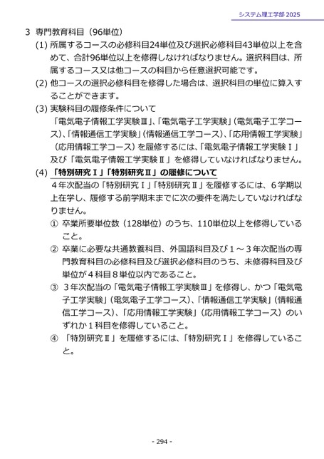 3専門教育科目(96単位)システム理工学部2025(1)所属するコースの必修科目24単位及び選択必修科目43単位以上を含めて、合計96単位以上を修得しなければなりません。選択科目は、所属するコース又は他コースの科目から任意選択可能です。(2)他コースの選択必修科目を修得した場合は、選択科目の単位に算入することができます。(3)実験科目の履修条件について「電気電子情報工学実験Ⅲ」、「電気電子工学実験」(電気電子工学コース)、「情報通信工学実験」(情報通信工学コース)、「応用情報工学実験」(応用情報工学コース)を履修するには、「電気電子情報工学実験Ⅰ」及び「電気電子情報工学実験Ⅱ」を修得していなければなりません。(4)「特別研究Ⅰ」「特別研究Ⅱ」の履修について4年次配当の「特別研究Ⅰ」「特別研究Ⅱ」を履修するには、6学期以上在学し、履修する前学期末までに次の要件を満たしていなければなりません。①卒業所要単位数(128単位)のうち、110単位以上を修得していること。②卒業に必要な共通教養科目、外国語科目及び1~3年次配当の専門教育科目の必修科目及び選択必修科目のうち、未修得科目及び単位が4科目8単位以内であること。③3年次配当の「電気電子情報工学実験Ⅲ」を修得し、かつ「電気電子工学実験」(電気電子工学コース)、「情報通信工学実験」(情報通信工学コース)、「応用情報工学実験」(応用情報工学コース)のいずれか1科目を修得していること。④「特別研究Ⅱ」を履修するには、「特別研究Ⅰ」を修得していること。-294-