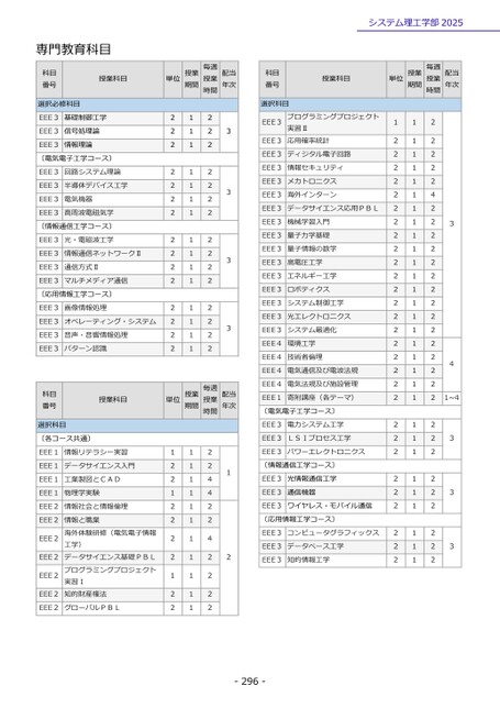 専門教育科目-296-システム理工学部2025科目番号授業科目単位授業期間授業毎週時間配当年次選択必修科目EEE3基礎制御工学212EEE3信号処理論212EEE3情報理論212EEE3回路システム理論212EEE3半導体デバイス工学212EEE3電気機器212EEE3高周波電磁気学212EEE3光・電磁波工学212EEE3情報通信ネットワークⅡ212EEE3通信方式Ⅱ212EEE3マルチメディア通信212EEE3画像情報処理212EEE3オペレーティング・システム212EEE3音声・音響情報処理212EEE3パターン認識212〔電気電子工学コース〕〔情報通信工学コース〕〔応用情報工学コース〕3333科目番号授業科目単位授業期間時間毎週授業配当年次選択科目EEE1情報リテラシー実習112EEE1データサイエンス入門212EEE1工業製図とCAD214EEE1物理学実験114EEE2情報社会と情報倫理212EEE2実習Ⅰデータサイエンス基礎PBL工学)情報と職業海外体験研修(電気電子情報プログラミングプロジェクト知的財産権法212EEE2214EEE2212EEE2112EEE2212EEE2グローバルPBL212〔各コース共通〕21科目番号授業科目単位授業期間授業毎週時間配当年次選択科目EEE3実習Ⅱプログラミングプロジェクト応用確率統計112EEE3212EEE3ディジタル電子回路212EEE3情報セキュリティ212EEE3メカトロニクス212EEE3海外インターン214EEE3データサイエンス応用PBL212EEE3機械学習入門212EEE3量子力学基礎212EEE3量子情報の数学212EEE3高電圧工学212EEE3エネルギー工学212EEE3ロボティクス212EEE3システム制御工学212EEE3光エレクトロニクス212EEE3システム最適化212EEE4環境工学212EEE4技術者倫理212EEE4電気通信及び電波法規212EEE4電気法規及び施設管理212EEE1寄附講座(各テーマ)2121~4EEE3電力システム工学212EEE3LSIプロセス工学212EEE3パワーエレクトロニクス212EEE3光情報通信工学212EEE3通信機器212EEE3ワイヤレス・モバイル通信212EEE3コンピュータグラフィックス212EEE3データベース工学212EEE3知的情報工学212〔電気電子工学コース〕33343〔情報通信工学コース〕〔応用情報工学コース〕