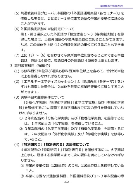 環境都市工学部2025(5)共通教養科目グローバル科目群の「外国語運用実習(各セミナー)」を修得した場合は、2セミナー2単位まで英語の卒業所要単位に含めることができます。(6)外国語検定試験の単位認定について第1・第2選択とした外国語の「検定認定1~3(各検定試験)」を修得した場合は、当該外国語の卒業所要単位に含めることができます。なお、この単位を上記(1)の当該外国語の単位に代えることもできます。(7)上記(3)~(6)を合わせて卒業所要単位に含めることのできる単位数は、英語は6単位、英語以外の外国語は4単位を上限とします。3専門教育科目(96単位)(1)必修科目53単位及び選択必修科目30単位以上を含めて、合計96単位以上を修得しなければなりません。(2)「エネルギー工学ディスカッション」と「地域再生(各テーマ)」をいずれも修得した場合は、2単位を限度に卒業所要単位に算入することができます。(3)実験科目の履修条件について「分析化学実験」「物理化学実験」「化学工学実験」及び「有機化学実験」を履修するには、履修する前学期末までに次の要件を具備していなければなりません。①2年次配当の「分析化学実験」及び「物理化学実験」を履修するには、1年次配当の「化学実験」を修得していること。②3年次配当の「化学工学実験」及び「有機化学実験」を履修するには、2年次配当の「分析化学実験」及び「物理化学実験」を修得していること。(4)「特別研究Ⅰ」「特別研究Ⅱ」の履修について4年次配当の「特別研究Ⅰ」「特別研究Ⅱ」を履修するには、6学期以上在学し、履修する前学期末までに次の要件を満たしていなければなりません。①卒業所要単位数(128単位)のうち、110単位以上を修得していること。②卒業に必要な共通教養科目、外国語科目及び1~3年次配当の専-322-