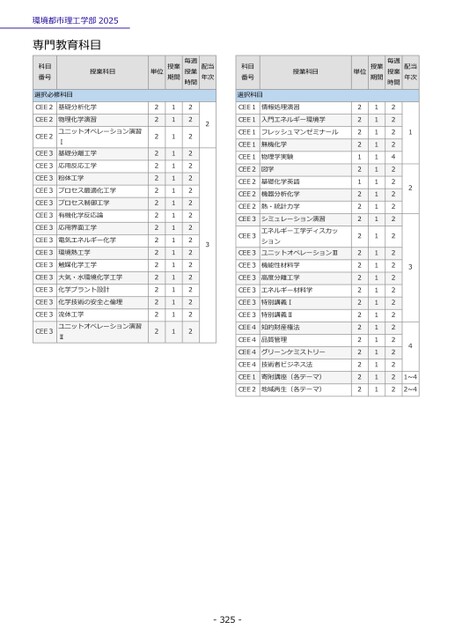 単位授業期間毎週授業時間配当年次科目番号授業科目単位授業期間毎週授業時間配当年次22222222222222222211111111111111111122222222222222222223選択科目CEE1情報処理演習CEE1入門エネルギー環境学CEE1フレッシュマンゼミナールCEE1無機化学CEE1物理学実験CEE2図学CEE2基礎化学英語CEE2機器分析化学CEE2熱・統計力学CEE3CEE3CEE3シミュレーション演習エネルギー工学ディスカッションユニットオペレーションⅢCEE3機能性材料学CEE3高度分離工学CEE3エネルギー材料学CEE3特別講義ⅠCEE3特別講義ⅡCEE4知的財産権法CEE4品質管理CEE4グリーンケミストリーCEE4技術者ビジネス法CEE1寄附講座(各テーマ)CEE2地域再生(各テーマ)22221212222222222222222111111111111111111111112222422222222222222222212341~42~4-325-環境都市理工学部2025専門教育科目科目番号授業科目選択必修科目CEE2基礎分析化学CEE2CEE2CEE3物理化学演習ユニットオペレーション演習Ⅰ基礎分離工学CEE3応用反応工学CEE3粉体工学CEE3プロセス最適化工学CEE3プロセス制御工学CEE3有機化学反応論CEE3応用界面工学CEE3電気エネルギー化学CEE3環境熱工学CEE3触媒化学工学CEE3大気・水環境化学工学CEE3化学プラント設計CEE3化学技術の安全と倫理CEE3CEE3流体工学ユニットオペレーション演習Ⅱ