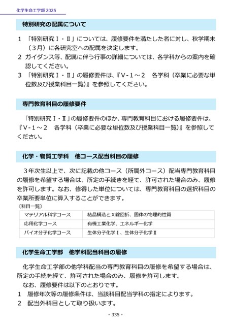 1「特別研究Ⅰ・Ⅱ」については、履修要件を満たした者に対し、秋学期末(3月)に各研究室への配属を決定します。2ガイダンス等、配属に伴う行事の詳細については、各学科からの案内を確認してください。3「特別研究Ⅰ・Ⅱ」の履修要件は、『Ⅴ-1~2各学科(卒業に必要な単位数及び授業科目一覧)』を参照してください。専門教育科目の履修要件「特別研究Ⅰ・Ⅱ」の履修要件のほか、専門教育科目における履修要件は、各学科(卒業に必要な単位数及び授業科目一覧)』を参照して『Ⅴ-1~2ください。学・物質工学科他コース配当科目の履修化3年次生以上で、次に記載の他コース(所属外コース)配当専門教育科目の履修を希望する場合は、所定の手続きを経て、許可された場合のみ、履修を許可します。なお、修得した単位については、専門教育科目の選択科目の卒業所要単位に算入することができます。〔科目一覧〕マテリアル科学コース応用化学コースバイオ分子化学コース結晶構造とX線回折、固体の物理的性質有機工業化学、エネルギー化学生体分子化学Ⅰ、生体分子化学Ⅱ学生命工学部他学科配当科目の履修化化学生命工学部の他学科配当の専門教育科目の履修を希望する場合は、所定の手続を経て、許可された場合のみ、履修を許可します。なお、履修要件は以下のとおりです。1履修年次等の履修条件は、当該科目配当学科の指定によります。2配当外科目として取り扱います。-335-化学生命工学部2025特別研究の配属について