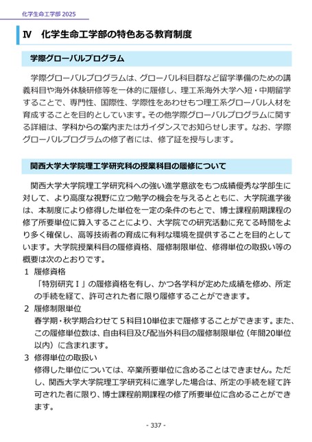 化学生命工学部2025Ⅳ化学生命工学部の特色ある教育制度学際グローバルプログラム学際グローバルプログラムは、グローバル科目群など留学準備のための講義科目や海外体験研修等を一体的に履修し、理工系海外大学へ短・中期留学することで、専門性、国際性、学際性をあわせもつ理工系グローバル人材を育成することを目的としています。その他学際グローバルプログラムに関する詳細は、学科からの案内またはガイダンスでお知らせします。なお、学際グローバルプログラムの修了者には、修了証を授与します。関西大学大学院理工学研究科の授業科目の履修について関西大学大学院理工学研究科への強い進学意欲をもつ成績優秀な学部生に対して、より高度な視野に立つ勉学の機会を与えるとともに、大学院進学後は、本制度により修得した単位を一定の条件のもとで、博士課程前期課程の修了所要単位に算入することにより、大学院での研究活動に充てる時間をより多く確保し、高等技術者の育成に有利な環境を提供することを目的としています。大学院授業科目の履修資格、履修制限単位、修得単位の取扱い等の概要は次のとおりです。1履修資格「特別研究Ⅰ」の履修資格を有し、かつ各学科が定めた成績を修め、所定の手続を経て、許可された者に限り履修することができます。2履修制限単位春学期・秋学期合わせて5科目10単位まで履修することができます。また、この履修単位数は、自由科目及び配当外科目の履修制限単位(年間20単位以内)に含まれます。3修得単位の取扱い修得した単位については、卒業所要単位に含めることはできません。ただし、関西大学大学院理工学研究科に進学した場合は、所定の手続を経て許可された者に限り、博士課程前期課程の修了所要単位に含めることができます。-337-