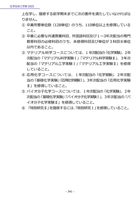 化学生命工学部2025上在学し、履修する前学期末までに次の要件を満たしていなければなりません。①卒業所要単位数(128単位)のうち、110単位以上を修得していること。②卒業に必要な共通教養科目、外国語科目及び1~3年次配当の専門教育科目の必修科目のうち、未修得科目及び単位が3科目8単位以内であること。③マテリアル科学コースについては、1年次配当の「化学実験」、2年次配当の「マテリアル科学実験Ⅰ」「マテリアル科学実験Ⅱ」、3年次配当の「マテリアル工学実験Ⅰ」「マテリアル工学実験Ⅱ」を修得していること。④応用化学コースについては、1年次配当の「化学実験」、2年次配当の「基礎化学実験」「応用化学実験Ⅰ」、3年次配当の「応用化学実験Ⅱ」を修得していること。⑤バイオ分子化学コースについては、1年次配当の「化学実験」、2年次配当の「基礎化学実験」「バイオ分子化学実験Ⅰ」、3年次配当の「バイオ分子化学実験Ⅱ」を修得していること。⑥「特別研究Ⅱ」を履修するには、「特別研究Ⅰ」を修得していること。-341-