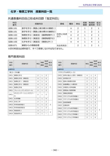 化学・物質工学科授業科目一覧共通教養科目自己形成科目群「指定科目」授業科目領域科目番号GEB1101GEB1101GEB1103GEB1103GEB1105GEB1071◎印の科目は必修科目で、すべて修得しなければなりません。数学を学ぶ(関数と微分積分の基礎Ⅰ)数学を学ぶ(関数と微分積分の基礎Ⅱ)物理を学ぶ(演習含)(基礎物理学Ⅰ)物理を学ぶ(演習含)(基礎物理学Ⅱ)化学を学ぶ(演習含)(基礎化学Ⅰ)基礎からの情報処理自然と向き合う社会を知る化学生命工学部2025種別単位授業期間毎週授業時間配当年次◎◎◎◎◎222242111111222242111111単位授業期間毎週授業時間配当年次科目番号必修科目授業科目単位授業期間毎週授業時間配当年次422222222222222111111111111111422222266222266232444222121133111111111111124442224222――134〔マテリアル科学コース〕CME2材料の強さと変形(演習含)CME2材料熱力学CME2固体の物理的性質CME2結晶構造とX線回折CME2状態図と材料組織CME2速度論と物質移動CME2情報処理演習CME2マテリアル科学実験ⅠCME2マテリアル科学実験ⅡCME3技術者倫理CME3金属材料CME3マテリアル科学演習ⅠCME3マテリアル科学演習ⅡCME3マテリアル工学実験ⅠCME3マテリアル工学実験Ⅱ-342-科目番号授業科目門教育科目専必修科目〔各コース共通〕CME1基礎化学ⅡCME1基礎化学Ⅲ(演習含)CME1物理化学Ⅰ(演習含)CME1物理化学Ⅱ(演習含)CME1物理化学ⅢCME1CME1CME1フレッシュマンゼミナールオリエンテーションゼミナール化学実験CME3安全工学CME3科学技術英語ⅠCME3科学技術英語ⅡCME4特別研究ⅠCME4特別研究Ⅱ