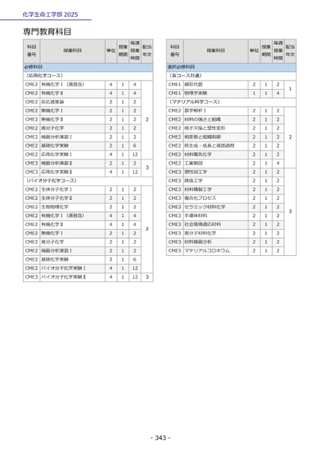 科目番号授業科目単位授業期間毎週授業時間配当年次212222222222222222211111111111111111112422222242222222222123選択必修科目〔各コース共通〕CME1線形代数CME1物理学実験〔マテリアル科学コース〕CME2数学解析ⅠCME2材料の強さと組織CME2格子欠陥と塑性変形CME2相変態と組織制御CME2核生成・成長と凝固過程CME2材料電気化学CME2工業製図CME3塑性加工学CME3鋳造工学CME3材料精製工学CME3複合化プロセスCME3セラミック材料化学CME3半導体材料CME3社会環境適応材料CME3高分子材料化学CME3材料機器分析CME3マテリアルコロキウム44222222424222442222441111111111111111111111442222261221222244222612122323-343-化学生命工学部2025専門教育科目科目番号必修科目授業科目単位授業期間毎週授業時間配当年次〔応用化学コース〕CME2有機化学Ⅰ(演習含)CME2有機化学ⅡCME2反応速度論CME2無機化学ⅠCME2無機化学ⅡCME2高分子化学CME2機器分析演習ⅠCME2基礎化学実験CME2応用化学実験ⅠCME3機器分析演習ⅡCME3応用化学実験Ⅱ〔バイオ分子化学コース〕CME2生体分子化学ⅠCME2生体分子化学ⅡCME2生物物理化学CME2有機化学Ⅰ(演習含)CME2有機化学ⅡCME2無機化学ⅠCME2高分子化学CME2機器分析演習ⅠCME2基礎化学実験CME2バイオ分子化学実験ⅠCME3バイオ分子化学実験Ⅱ