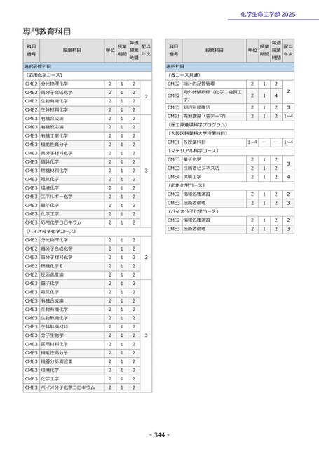 化学生命工学部2025単位授業期間毎週授業時間配当年次科目番号授業科目単位授業期間毎週授業時間配当年次222211112422231~41~4――1~4222222211111112222222342323選択科目〔各コース共通〕CME2CME2CME3統計的品質管理海外体験研修(化学・物質工学)知的財産権法CME1寄附講座(各テーマ)〔医工薬連環科学プログラム〕〔大阪医科薬科大学設置科目〕CME1各授業科目〔マテリアル科学コース〕CME3量子化学CME3技術者ビジネス法CME4環境工学〔応用化学コース〕CME2情報処理演習CME3技術者倫理〔バイオ分子化学コース〕CME2情報処理演習CME3技術者倫理-344-2323222222222222222222222222222222222221111111111111111111111111111111111122222222222222222222222222222222222専門教育科目科目番号授業科目選択必修科目〔応用化学コース〕CME2分光物理化学CME2高分子合成化学CME2生物有機化学CME2生体材料化学CME3有機合成論CME3有機反応論CME3有機工業化学CME3機能性高分子CME3高分子材料化学CME3錯体化学CME3無機材料化学CME3電気化学CME3環境化学CME3エネルギー化学CME3量子化学CME3化学工学CME3応用化学コロキウム〔バイオ分子化学コース〕CME2分光物理化学CME2高分子合成化学CME2高分子材料化学CME2無機化学ⅡCME2反応速度論CME3量子化学CME3電気化学CME3有機合成論CME3生物有機化学CME3生物無機化学CME3生体無機材料CME3分子生物学CME3医用材料化学CME3機能性高分子CME3機器分析演習ⅡCME3環境化学CME3化学工学CME3バイオ分子化学コロキウム
