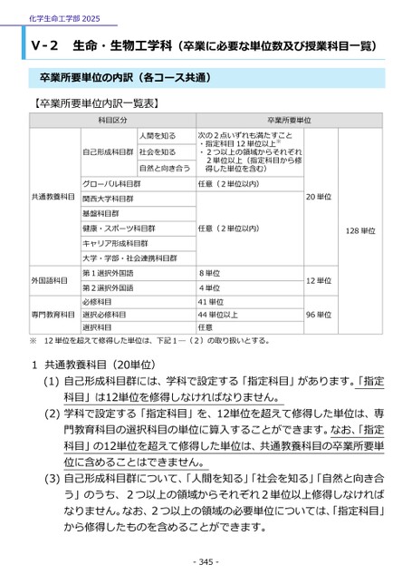 化学生命工学部2025Ⅴ-2生命・生物工学科(卒業に必要な単位数及び授業科目一覧)基盤科目群健康・スポーツ科目群キャリア形成科目群大学・学部・社会連携科目群任意(2単位以内)128単位12単位を超えて修得した単位は、下記1―(2)の取り扱いとする。共通教養科目(20単位)(1)自己形成科目群には、学科で設定する「指定科目」があります。「指定科目」は12単位を修得しなければなりません。(2)学科で設定する「指定科目」を、12単位を超えて修得した単位は、専門教育科目の選択科目の単位に算入することができます。なお、「指定科目」の12単位を超えて修得した単位は、共通教養科目の卒業所要単位に含めることはできません。(3)自己形成科目群について、「人間を知る」「社会を知る」「自然と向き合う」のうち、2つ以上の領域からそれぞれ2単位以上修得しなければなりません。なお、2つ以上の領域の必要単位については、「指定科目」から修得したものを含めることができます。-345-※1外国語科目専門教育科目第1選択外国語第2選択外国語必修科目選択必修科目選択科目8単位4単位41単位44単位以上任意12単位96単位卒業所要単位の内訳(各コース共通)【卒業所要単位内訳一覧表】科目区分人間を知る自己形成科目群社会を知る自然と向き合う卒業所要単位次の2点いずれも満たすこと・指定科目12単位以上※・2つ以上の領域からそれぞれ2単位以上(指定科目から修得した単位を含む)グローバル科目群任意(2単位以内)共通教養科目関西大学科目群20単位