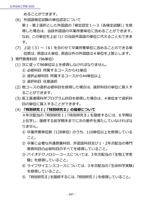化学生命工学部2025めることができます。外国語検定試験の単位認定について(6)第1・第2選択とした外国語の「検定認定1~3(各検定試験)」を修得した場合は、当該外国語の卒業所要単位に含めることができます。なお、この単位を上記(1)の当該外国語の単位に代えることもできます。上記(3)~(6)を合わせて卒業所要単位に含めることのできる単位数は、英語は6単位、英語以外の外国語は4単位を上限とします。(7)3専門教育科目(96単位)(1)次に従って96単位以上を修得しなければなりません。①必修科目所属するコースから41単位②選択必修科目所属するコースから44単位以上③選択科目任意選択(2)他コースの選択必修科目を修得した場合は、選択科目の単位に算入することができます。(3)医工薬連環科学プログラム科目を修得した場合は、4単位まで選択科目の単位に算入することができます。(4)「特別研究Ⅰ」「特別研究Ⅱ」の履修について4年次配当の「特別研究Ⅰ」「特別研究Ⅱ」を履修するには、6学期以上在学し、履修する前学期末までに次の要件を満たしていなければなりません。①卒業所要単位数(128単位)のうち、110単位以上を修得していること。②卒業に必要な共通教養科目、外国語科目及び1・2年次配当の専門教育科目の必修科目のすべてを修得していること。③バイオテクノロジーコースについては、3年次配当の「生物工学実験」を修得していること。④ライフサイエンスコースについては、3年次配当の「生命科学実験」を修得していること。⑤「特別研究Ⅱ」を履修するには、「特別研究Ⅰ」を修得していること。-347-