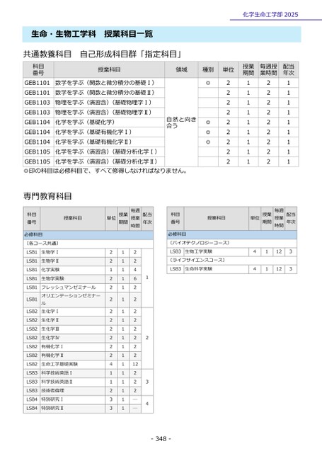 生命・生物工学科授業科目一覧化学生命工学部2025共通教養科目自己形成科目群「指定科目」科目番号授業科目領域種別単位授業期間毎週授業時間配当年次GEB1101GEB1101GEB1103GEB1103GEB1104GEB1104GEB1104GEB1105GEB1105◎印の科目は必修科目で、すべて修得しなければなりません。数学を学ぶ(関数と微分積分の基礎Ⅰ)数学を学ぶ(関数と微分積分の基礎Ⅱ)物理を学ぶ(演習含)(基礎物理学Ⅰ)物理を学ぶ(演習含)(基礎物理学Ⅱ)化学を学ぶ(基礎化学)化学を学ぶ(基礎有機化学Ⅰ)化学を学ぶ(基礎有機化学Ⅱ)化学を学ぶ(演習含)(基礎分析化学Ⅰ)化学を学ぶ(演習含)(基礎分析化学Ⅱ)自然と向き合う◎◎◎◎222222222111111111222222222111111111単位授業期間毎週授業時間配当年次科目番号必修科目授業科目単位授業期間毎週授業時間配当年次門教育科目専科目番号授業科目必修科目〔各コース共通〕4411121233〔バイオテクノロジーコース〕LSB3生物工学実験〔ライフサイエンスコース〕LSB3生命科学実験-348-生物学Ⅰ生物学Ⅱ化学実験生物学実験フレッシュマンゼミナールオリエンテーションゼミナール生化学Ⅰ生化学Ⅱ生化学Ⅲ生化学Ⅳ有機化学Ⅰ有機化学Ⅱ生命工学基礎実験科学技術英語Ⅰ科学技術英語Ⅱ技術者倫理特別研究Ⅰ特別研究Ⅱ22122222222241123311111111111111111122462222222212222――1234LSB1LSB1LSB1LSB1LSB1LSB1LSB2LSB2LSB2LSB2LSB2LSB2LSB2LSB3LSB3LSB3LSB4LSB4