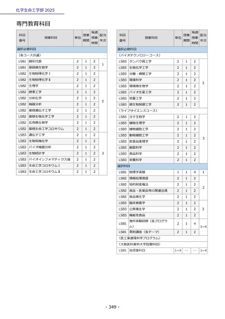 化学生命工学部2025専門教育科目科目番号授業科目選択必修科目〔各コース共通〕LSB1LSB1LSB2LSB2LSB2LSB2LSB2LSB2LSB2LSB2LSB2LSB2LSB3LSB3LSB3LSB3LSB3LSB3LSB3線形代数基礎微生物学生物物理化学Ⅰ生物物理化学Ⅱ生理学酵素工学分析化学機器分析基礎遺伝子工学基礎生物化学工学応用微生物学基礎生命工学コロキウム遺伝子工学生物有機化学バイオ機器分析生物統計学バイオインフォマティクス論生命工学コロキウムⅠ生命工学コロキウムⅡ222222222222222222211111111111111111112222222222222222222123単位授業期間毎週授業時間配当年次科目番号授業科目単位授業期間毎週授業時間配当年次選択必修科目〔バイオテクノロジーコース〕LSB3LSB3LSB3LSB3LSB3LSB3LSB3LSB3タンパク質工学生物化学工学分離・精製工学環境科学環境微生物学バイオ生産工学培養工学微生物制御工学〔ライフサイエンスコース〕LSB3LSB3LSB3LSB3LSB3LSB3LSB3LSB3分子生物学植物生理学植物細胞工学動物細胞工学医薬品薬理学創薬科学食品科学栄養科学選択科目LSB1LSB2LSB2LSB2LSB2LSB3LSB3LSB3LSB1LSB1物理学実験情報処理演習知的財産権法食品・医薬品等の関連法規食品衛生学臨床検査学公衆衛生学機能性食品海外体験研修(各プログラム)寄附講座(各テーマ)〔医工薬連環科学プログラム〕〔大阪医科薬科大学設置科目〕222222222222222212222222221111111111111111111111111122222222222222224222222242331231~4LSB1各授業科目1~4――1~4-349-