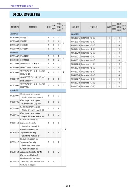 単位授業期間毎週授業時間配当年次2222222222222211111111111111444444444444441~4科目番号授業科目自由科目FOS1016Japanese(1-a)FOS1017Japanese(1-b)FOS1018Japanese(2-a)FOS1019Japanese(2-b)FOS1020Japanese(3-a)FOS1021Japanese(3-b)FOS1022Japanese(4-a)FOS1023Japanese(4-b)FOS1024Japanese(5-a)FOS1025Japanese(5-b)FOS1026Japanese(6-a)FOS1027Japanese(6-b)FOS1028Japanese(7-a)FOS1029Japanese(7-b)-351-化学生命工学部2025外国人留学生科目科目番号授業科目単位授業期間毎週授業時間配当年次1111111111111111111111231~444442222222222222222必修科目FOS1001日本語ⅠFOS1002日本語ⅡFOS1003日本語ⅢFOS1004日本語Ⅳ選択科目FOS1005日本事情ⅠFOS1006日本事情ⅡFOS2001実践ビジネス日本語ⅠFOS2002FOS2003FOS2004FOS3001自由科目FOS1007FOS1008FOS1009FOS1010FOS1011FOS1012FOS1013FOS1014FOS1015実践ビジネス日本語ⅡキャリアデザインⅠ(日本の社会と企業)キャリアデザインⅡ(日本の就職と働き方)キャリアデザインⅢ(日本の社会で働く)ContemporaryJapan(UnderstandingJapan)ContemporaryJapan(ResearchingJapan)ContemporaryJapan(JapaninMassMedia1)ContemporaryJapan(JapaninMassMedia2)CommunicationinJapaneseSociety(LearningKansai1)CommunicationinJapaneseSociety(LearningKansai2)CommunicationinJapaneseSociety(BusinessJapanese)CommunicationinJapaneseSociety(JPNCorporateCulture)Field-BasedLearning(SocietyandWorkplaceCultureinJapan)22222222222222222222
