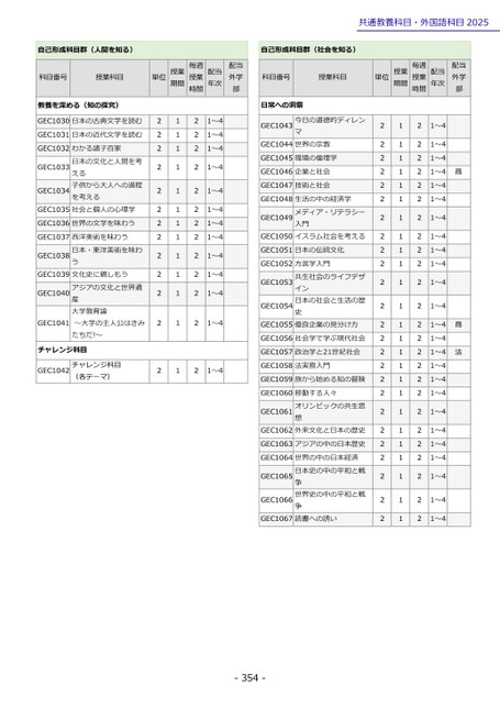 共通教養科目・外国語科目2025自己形成科目群(人間を知る)自己形成科目群(社会を知る)単位授業期間毎週授業時間配当年次配当外学部22222222222222222222222221111111111111111111111111商商法22222222222222222222222221~41~41~41~41~41~41~41~41~41~41~41~41~41~41~41~41~41~41~41~41~41~41~41~41~4科目番号授業科目教養を深める(知の探究)GEC1030日本の古典文学を読むGEC1031日本の近代文学を読むGEC1032わかる諸子百家GEC1033GEC1034日本の文化と人間を考える子供から大人への過程を考えるGEC1035社会と個人の心理学GEC1036世界の文学を味わうGEC1037西洋美術を味わうGEC1038日本・東洋美術を味わうGEC1039文化史に親しもうGEC1040GEC1041アジアの文化と世界遺産大学教育論~大学の主人公はきみたちだ!~チャレンジ科目GEC1042チャレンジ科目(各テーマ)単位授業期間毎週授業時間配当年次配当外学部2222222222221111111111112222222222221~41~41~41~41~41~41~41~41~41~41~41~42121~4科目番号授業科目日常への洞察GEC1043今日の道徳的ディレンマGEC1044世界の宗教GEC1045環境の倫理学GEC1046企業と社会GEC1047技術と社会GEC1048生活の中の経済学GEC1049メディア・リテラシー入門GEC1050イスラム社会を考えるGEC1051日本の伝統文化GEC1052方言学入門GEC1053GEC1054共生社会のライフデザイン日本の社会と生活の歴史GEC1055優良企業の見分け方GEC1056社会学で学ぶ現代社会GEC1057政治学と21世紀社会GEC1058法実務入門GEC1059旅から始める知の冒険GEC1060移動する人々GEC1061オリンピックの共生思想GEC1062外来文化と日本の歴史GEC1063アジアの中の日本歴史GEC1064世界の中の日本経済GEC1065GEC1066日本史の中の平和と戦争世界史の中の平和と戦争GEC1067読書への誘い-354-