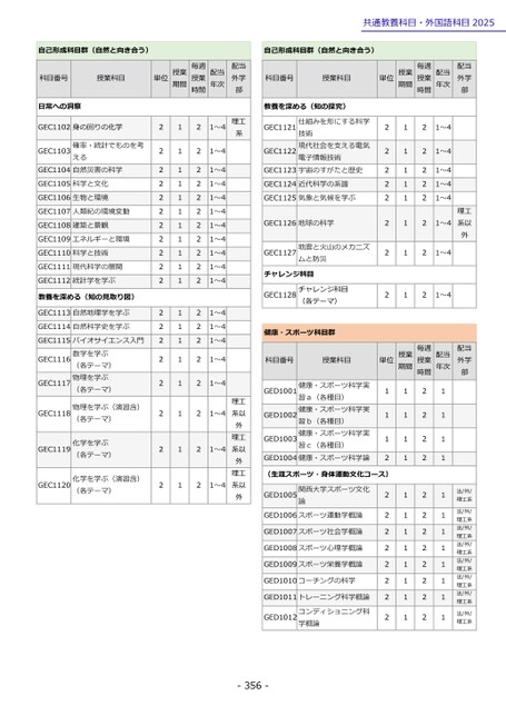 共通教養科目・外国語科目2025自己形成科目群(自然と向き合う)自己形成科目群(自然と向き合う)配当外学部理工系科目番号授業科目教養を深める(知の探究)GEC1121GEC1122仕組みを形にする科学技術現代社会を支える電気電子情報技術GEC1123宇宙のすがたと歴史GEC1124近代科学の系譜GEC1125気象と気候を学ぶGEC1126地球の科学GEC1127地震と火山のメカニズムと防災チャレンジ科目GEC1128チャレンジ科目(各テーマ)健康・スポーツ科目群科目番号授業科目単位授業期間毎週授業時間配当年次配当外学部222222221111111122222221~41~41~41~41~41~41~421~4理工系以外単位授業期間毎週授業時間配当年次配当外学部理工系以外理工系以外理工系以外GED1001GED1002GED1003健康・スポーツ科学実習a(各種目)健康・スポーツ科学実習b(各種目)健康・スポーツ科学実習c(各種目)GED1004健康・スポーツ科学論1112(生涯スポーツ・身体運動文化コース)GED1005関西大学スポーツ文化論GED1006スポーツ運動学概論GED1007スポーツ社会学概論GED1008スポーツ心理学概論GED1009スポーツ栄養学概論GED1010コーチングの科学GED1011トレーニング科学概論GED1012コンディショニング科学概論22222222111111111111222222222222111111111111法/外/理工系法/外/理工系法/外/理工系法/外/理工系法/外/理工系法/外/理工系法/外/理工系法/外/理工系-356-科目番号授業科目日常への洞察GEC1102身の回りの化学GEC1103確率・統計でものを考えるGEC1104自然災害の科学GEC1105科学と文化GEC1106生物と環境GEC1107人類紀の環境変動GEC1108建築と景観GEC1109エネルギーと環境GEC1110科学と技術GEC1111現代科学の展開GEC1112統計学を学ぶ教養を深める(知の見取り図)GEC1113自然地理学を学ぶGEC1114自然科学史を学ぶGEC1115バイオサイエンス入門GEC1116GEC1117数学を学ぶ(各テーマ)物理を学ぶ(各テーマ)GEC1118物理を学ぶ(演習含)(各テーマ)GEC1119化学を学ぶ(各テーマ)GEC1120化学を学ぶ(演習含)(各テーマ)単位授業期間毎週授業時間配当年次22222222222222222221111111111111111111222222222222222221~41~41~41~41~41~41~41~41~41~41~41~41~41~41~41~41~421~421~4