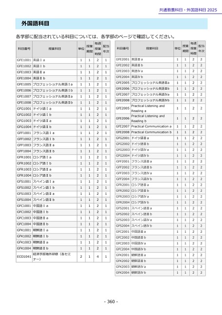 -360-共通教養科目・外国語科目2025外国語科目各学部に配当されている科目については、各学部のページで確認してください。科目番号授業科目単位期間授業時間毎週授業年次配当GFE1001英語Ⅰa1121GFE1002英語Ⅰb1121GFE1003英語Ⅱa1121GFE1004英語Ⅱb1121GFE1005プロフェッショナル英語Ⅰa1121GFE1006プロフェッショナル英語Ⅰb1121GFE1007プロフェッショナル英語Ⅱa1121GFE1008プロフェッショナル英語Ⅱb1121GFG1001ドイツ語Ⅰa1121GFG1002ドイツ語Ⅰb1121GFG1003ドイツ語Ⅱa1121GFG1004ドイツ語Ⅱb1121GFF1001フランス語Ⅰa1121GFF1002フランス語Ⅰb1121GFF1003フランス語Ⅱa1121GFF1004フランス語Ⅱb1121GFR1001ロシア語Ⅰa1121GFR1002ロシア語Ⅰb1121GFR1003ロシア語Ⅱa1121GFR1004ロシア語Ⅱb1121GFS1001スペイン語Ⅰa1121GFS1002スペイン語Ⅰb1121GFS1003スペイン語Ⅱa1121GFS1004スペイン語Ⅱb1121GFC1001中国語Ⅰa1121GFC1002中国語Ⅰb1121GFC1003中国語Ⅱa1121GFC1004中国語Ⅱb1121GFK1001朝鮮語Ⅰa1121GFK1002朝鮮語Ⅰb1121GFK1003朝鮮語Ⅱa1121GFK1004ナー)朝鮮語Ⅱb経済学部海外研修(各セミ1121ECO10412141科目番号授業科目単位期間授業時間毎週授業年次配当GFE2001英語Ⅲa1122GFE2002英語Ⅲb1122GFE2003英語Ⅳa1122GFE2004英語Ⅳb1122GFE2005プロフェッショナル英語Ⅲa1122GFE2006プロフェッショナル英語Ⅲb1122GFE2007プロフェッショナル英語Ⅳa1122GFE2008PracticalCommunicationaPracticalListeningandReadingaプロフェッショナル英語ⅣbPracticalListeningandReadingb1122GFE20051122GFE20061122GFE20071122GFE2008PracticalCommunicationb1122GFG2001ドイツ語Ⅲa1122GFG2002ドイツ語Ⅲb1122GFG2003ドイツ語Ⅳa1122GFG2004ドイツ語Ⅳb1122GFF2001フランス語Ⅲa1122GFF2002フランス語Ⅲb1122GFF2003フランス語Ⅳa1122GFF2004フランス語Ⅳb1122GFR2001ロシア語Ⅲa1122GFR2002ロシア語Ⅲb1122GFR2003ロシア語Ⅳa1122GFR2004ロシア語Ⅳb1122GFS2001スペイン語Ⅲa1122GFS2002スペイン語Ⅲb1122GFS2003スペイン語Ⅳa1122GFS2004スペイン語Ⅳb1122GFC2001中国語Ⅲa1122GFC2002中国語Ⅲb1122GFC2003中国語Ⅳa1122GFC2004中国語Ⅳb1122GFK2001朝鮮語Ⅲa1122GFK2002朝鮮語Ⅲb1122GFK2003朝鮮語Ⅳa1122GFK2004朝鮮語Ⅳb1122